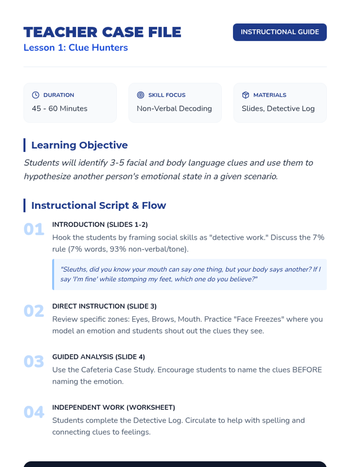 A comprehensive 6-week social skills and problem-solving program designed specifically for 2nd-grade students with ASD. The sequence uses a 'Social Detective' theme to teach self-regulation, perspective taking, empathy, and social problem-solving through visual supports and concrete activities.