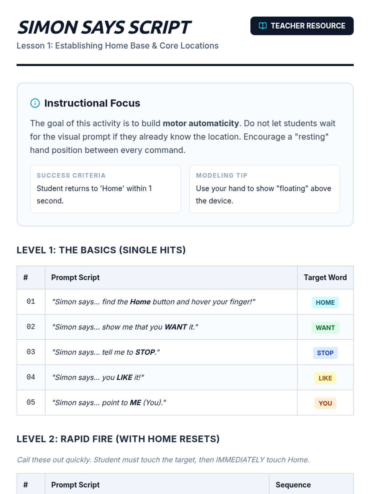 A specialized sequence for 3rd-grade students to build motor automaticity and muscle memory when navigating AAC devices. The unit progresses from single-word location to complex multi-step phrase construction, culminating in a blind navigation challenge to prove mastery.