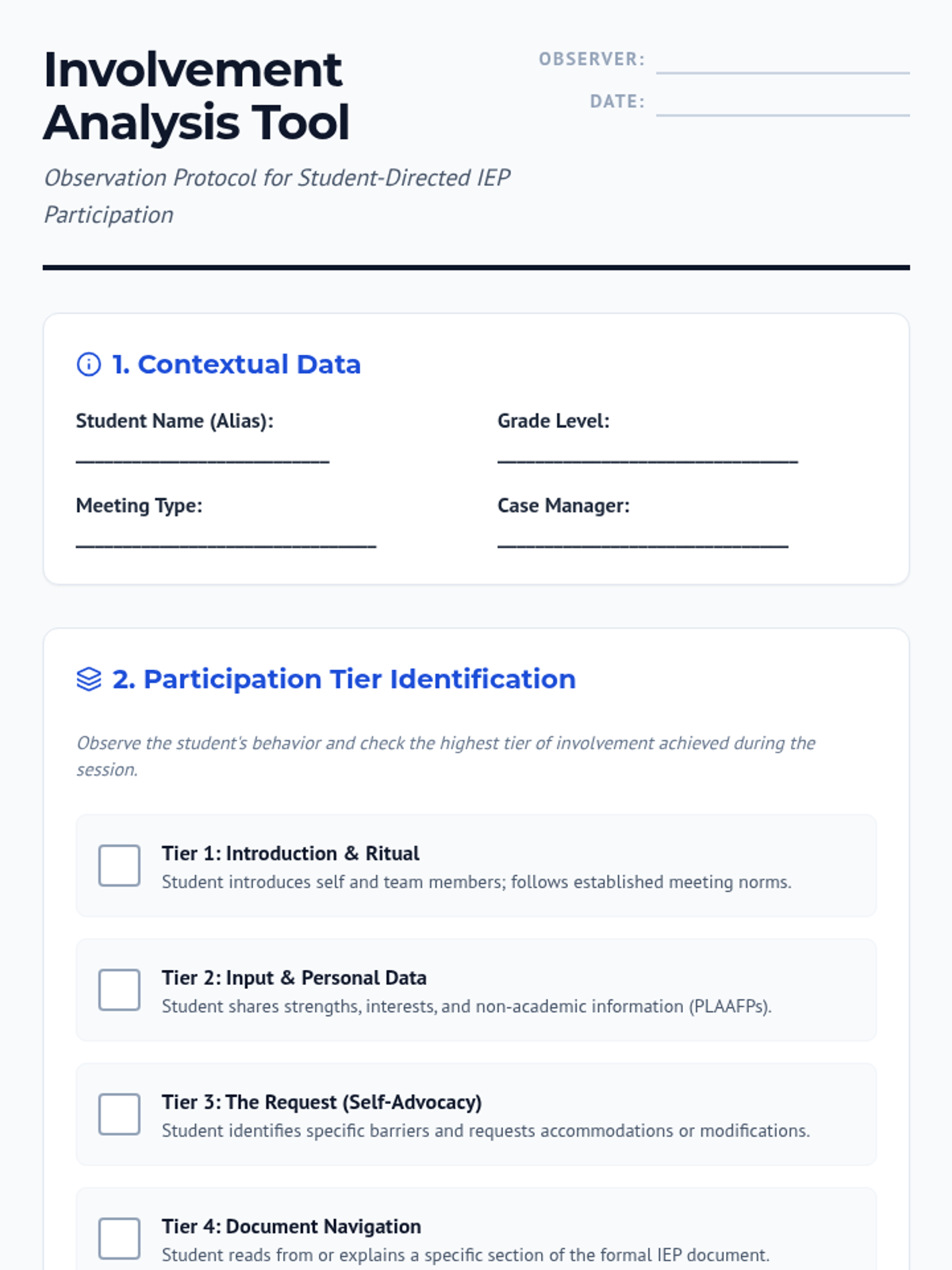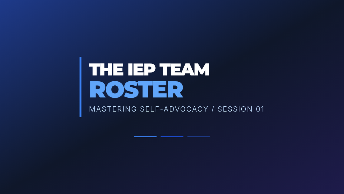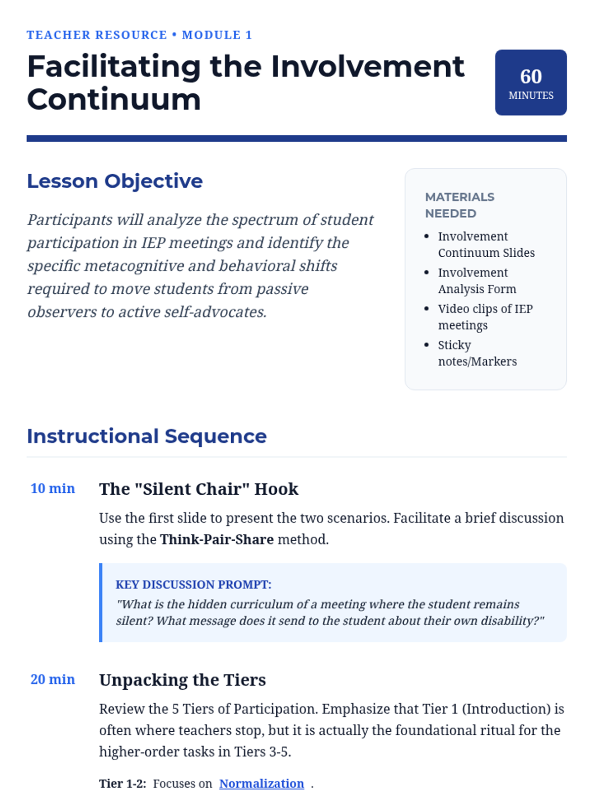 A comprehensive sequence for graduate students to master the implementation of Student-Led IEPs (SLIEPs). This sequence explores the continuum of student involvement, preparation protocols, visual advocacy aids, meeting facilitation techniques, and post-meeting reflection to empower students as self-advocates for their own accommodations.