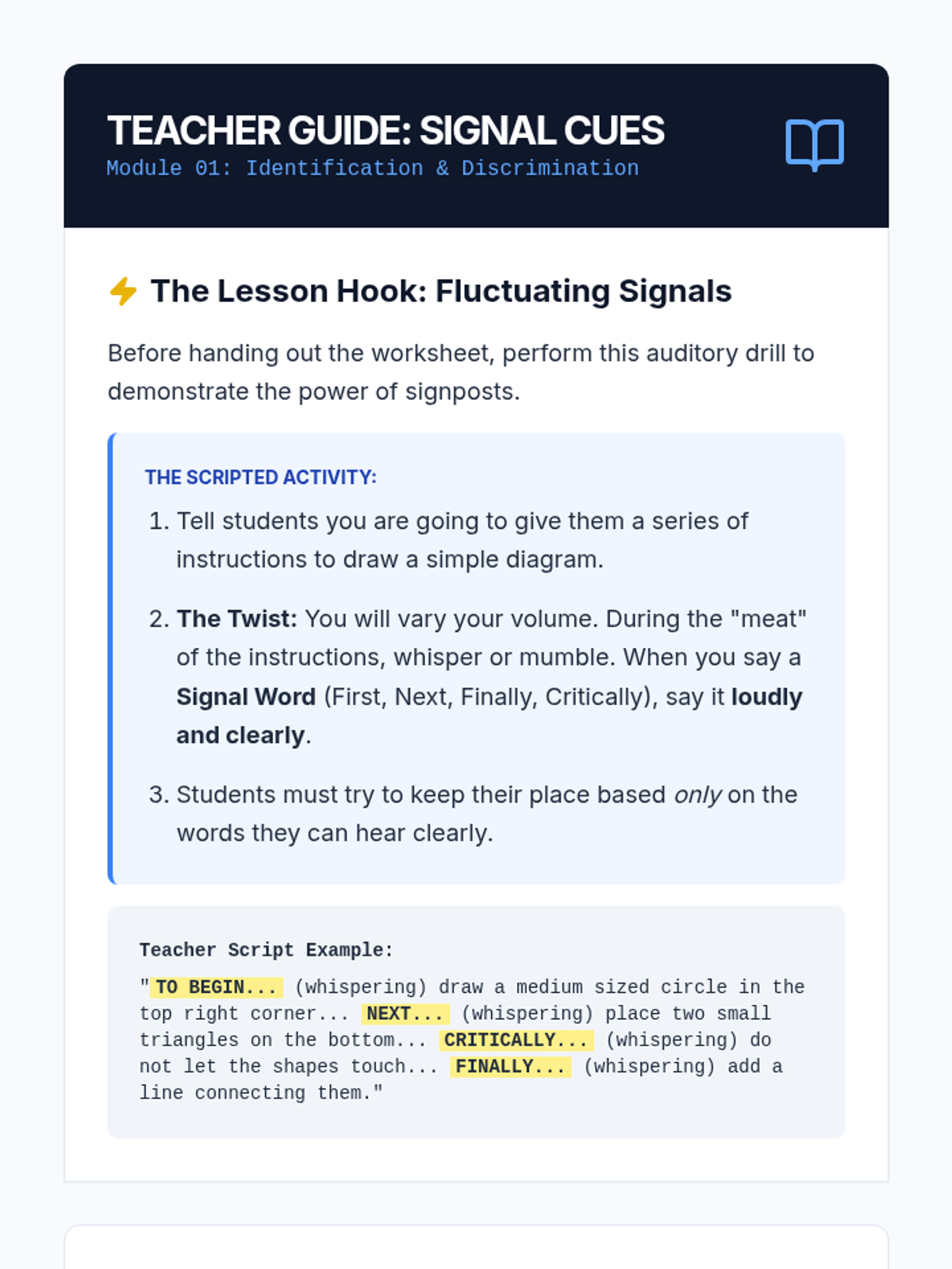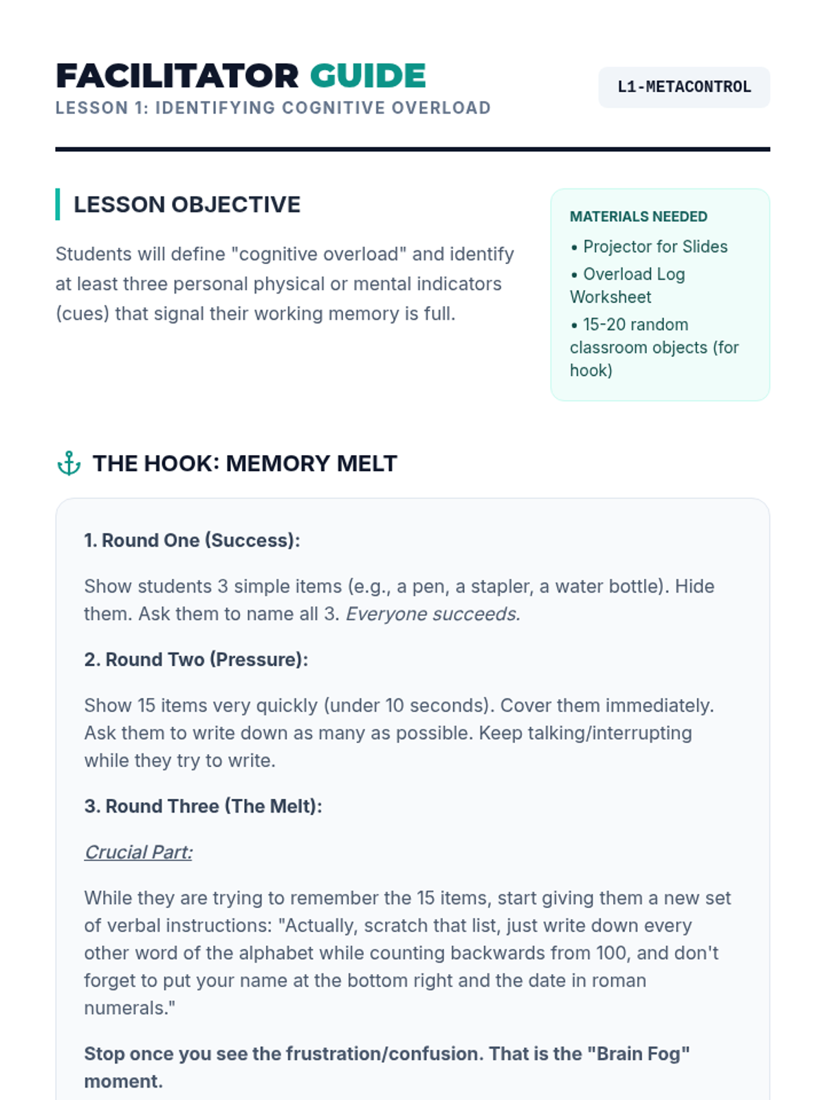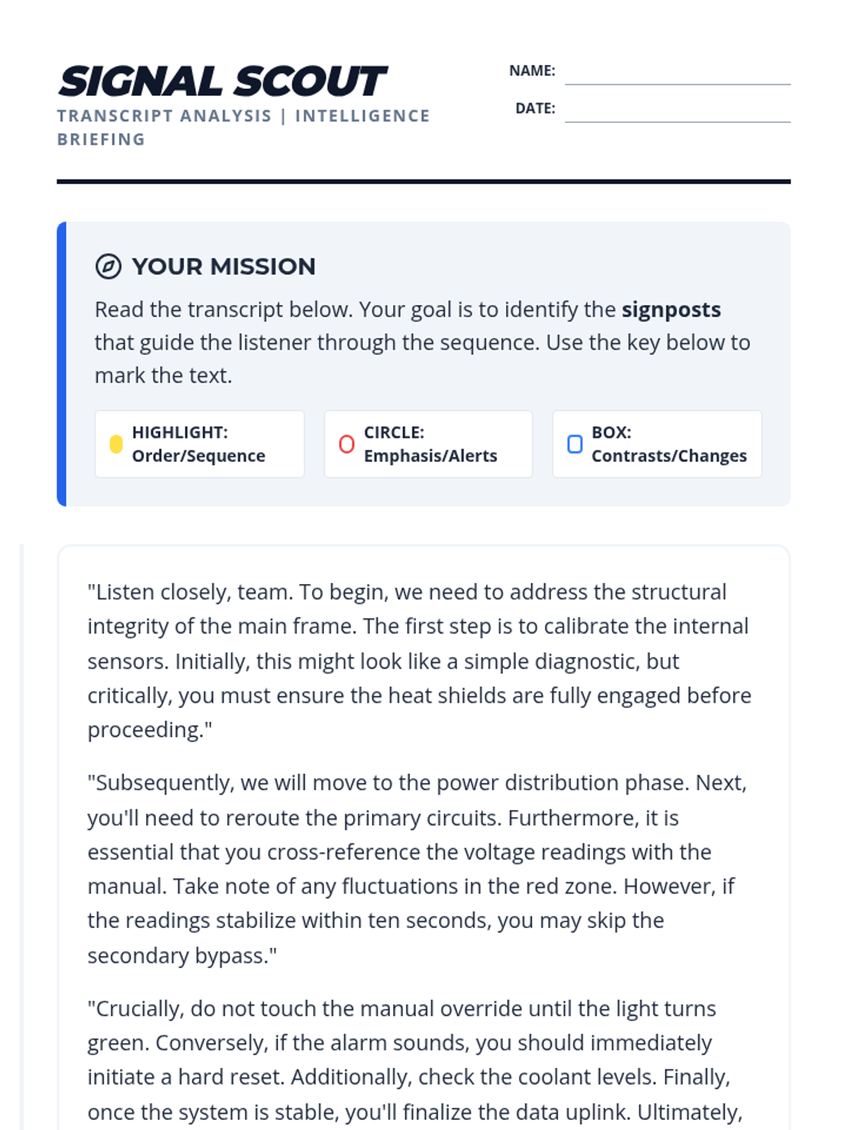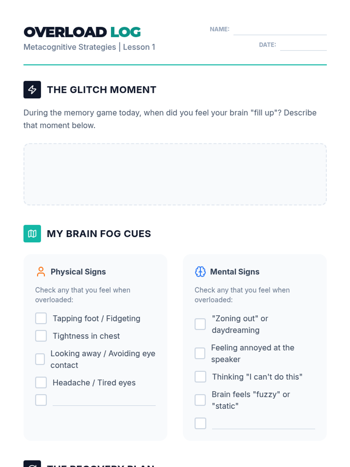 This sequence empowers 8th-grade students with metacognitive strategies to recognize cognitive overload and advocate for single-step directions. It covers identifying personal cues of overload, deconstructing complex instructions, and practicing self-advocacy scripts.