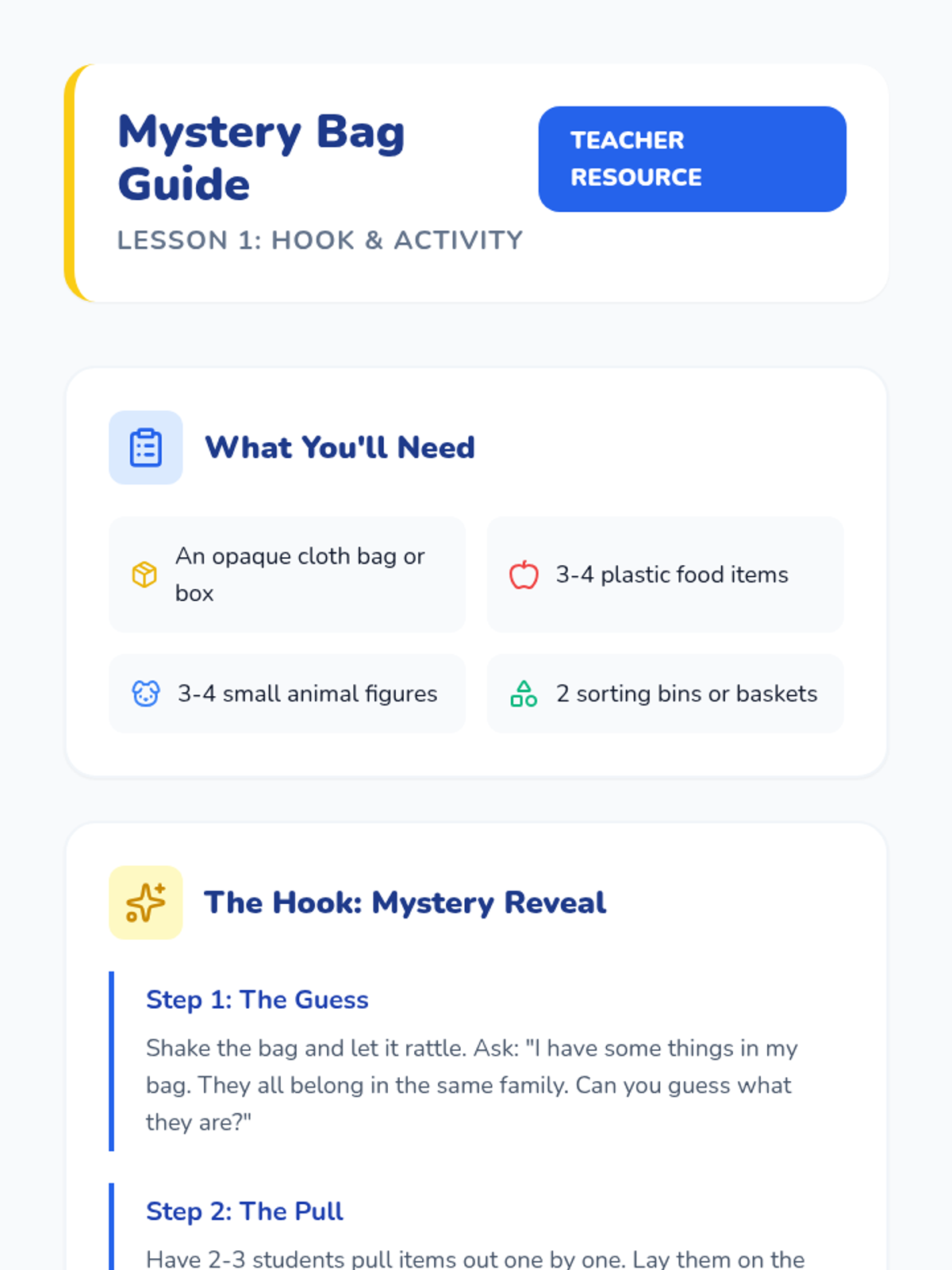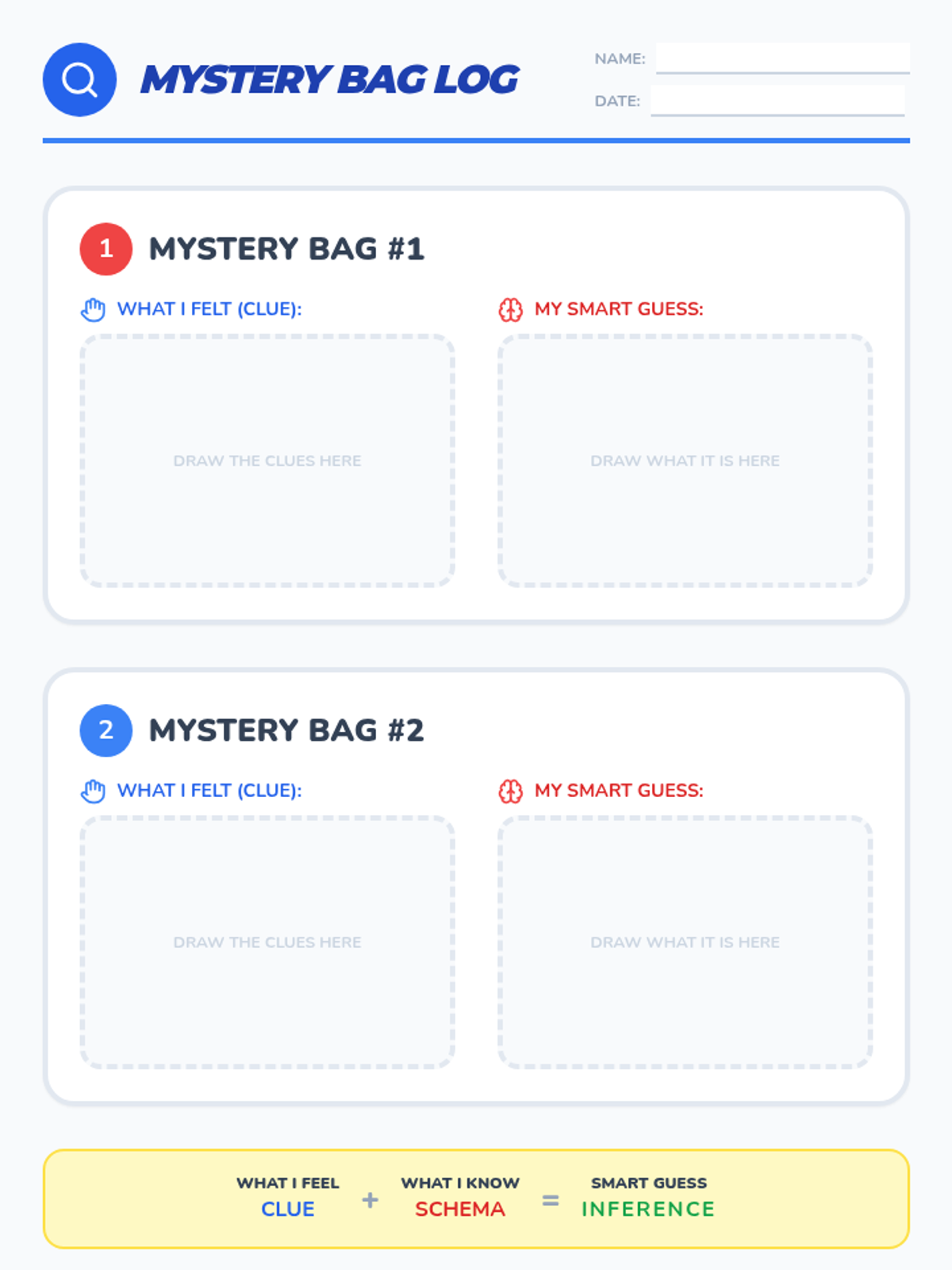 A foundational inference sequence for Kindergarten Special Education students, moving from concrete sensory experiences (touch, sound, sight) to abstract story-based predictions. Students learn the 'Clue + Schema = Inference' formula through tactile, auditory, and visual activities.