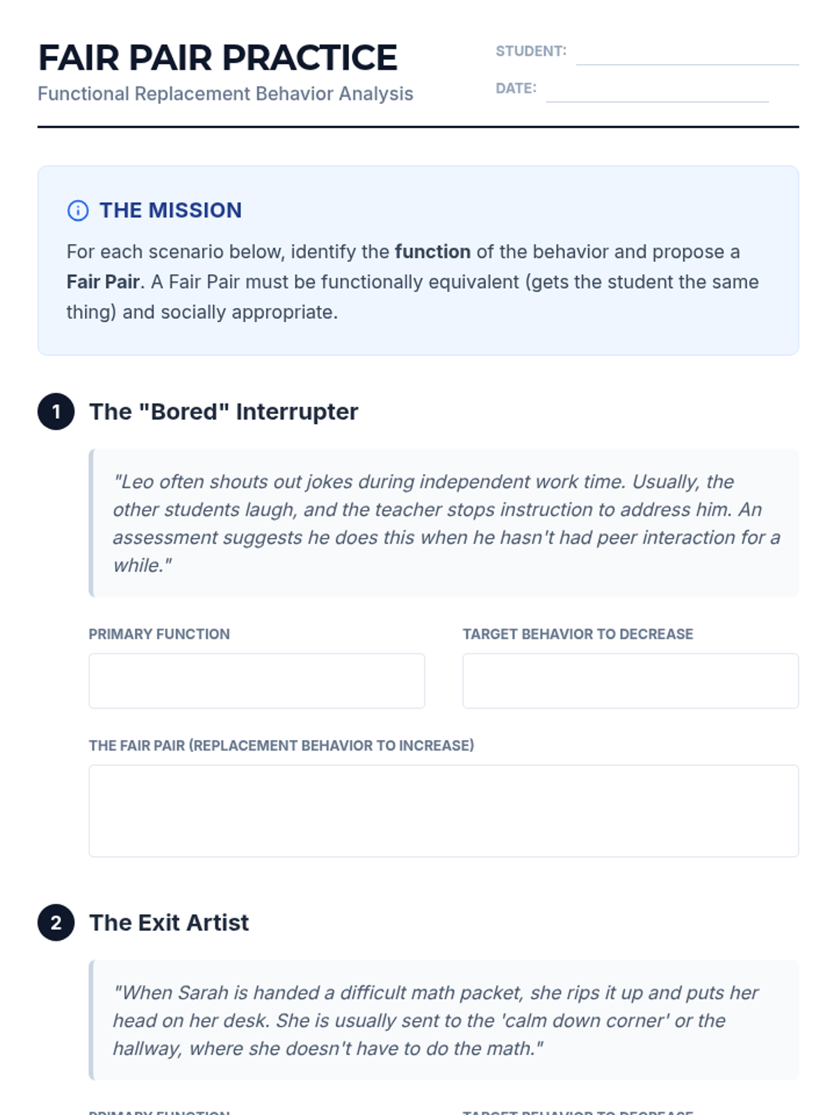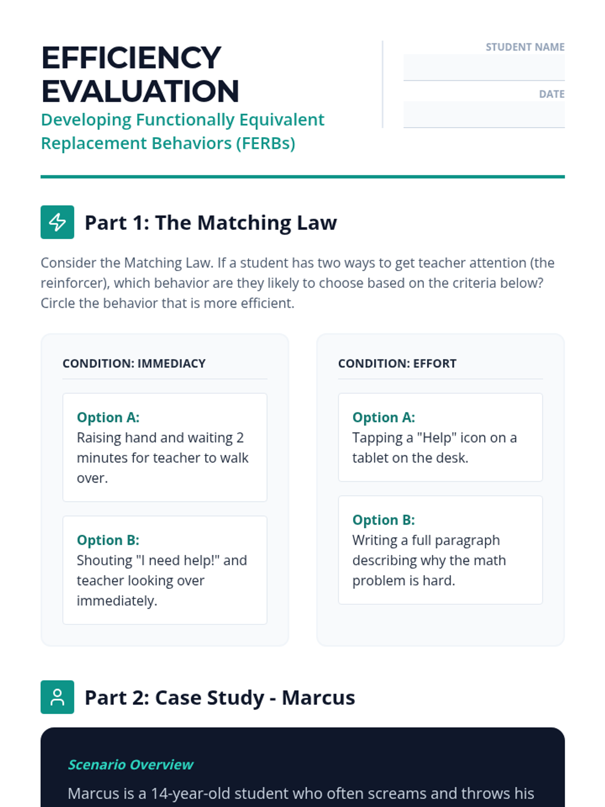 This sequence for undergraduate students explores the design and implementation of Functionally Equivalent Replacement Behaviors (FERBs). Students will learn to apply the Matching Law, design Functional Communication Training (FCT) protocols, and use shaping and chaining to teach adaptive skills that serve the same purpose as challenging behaviors.