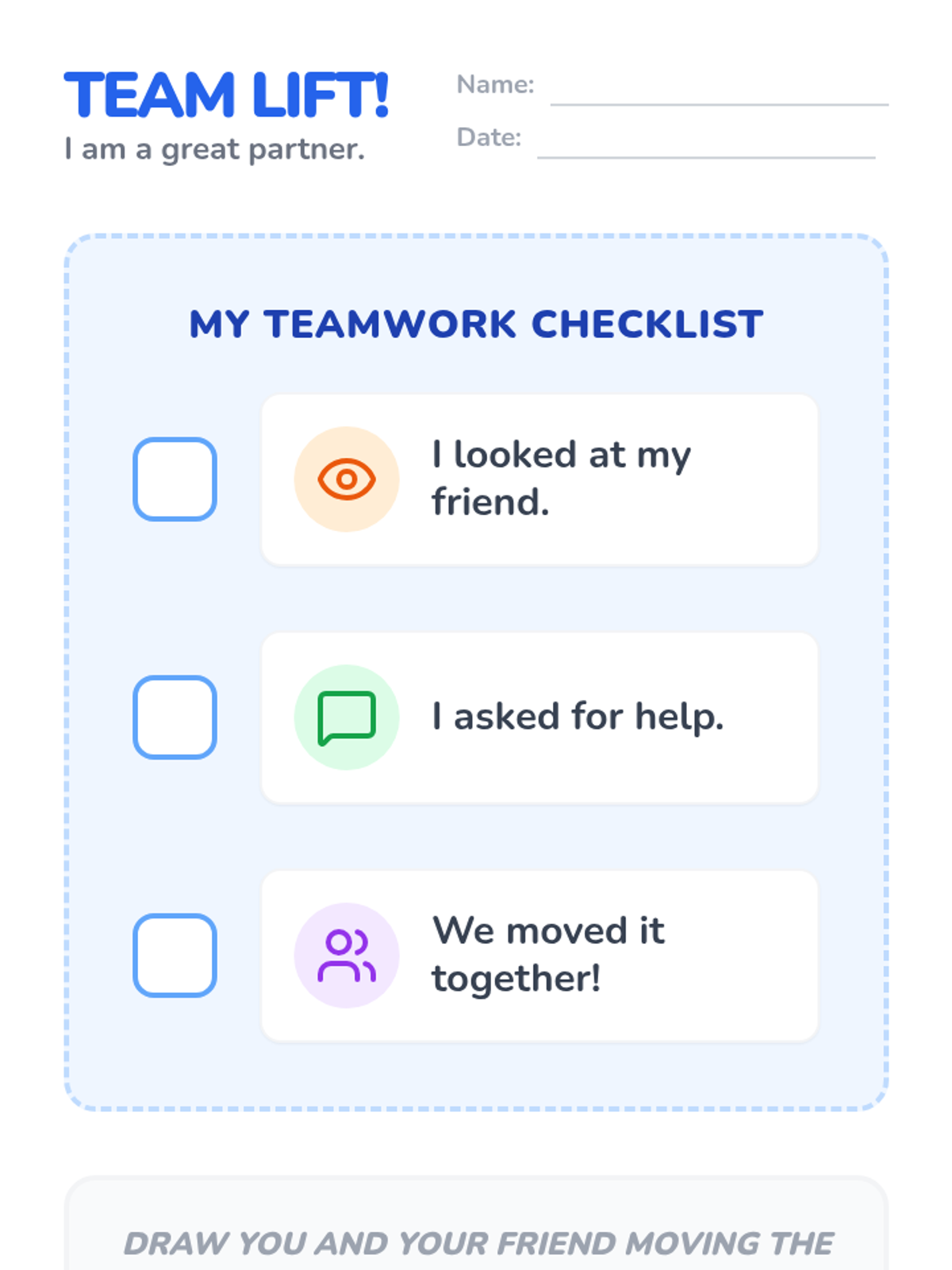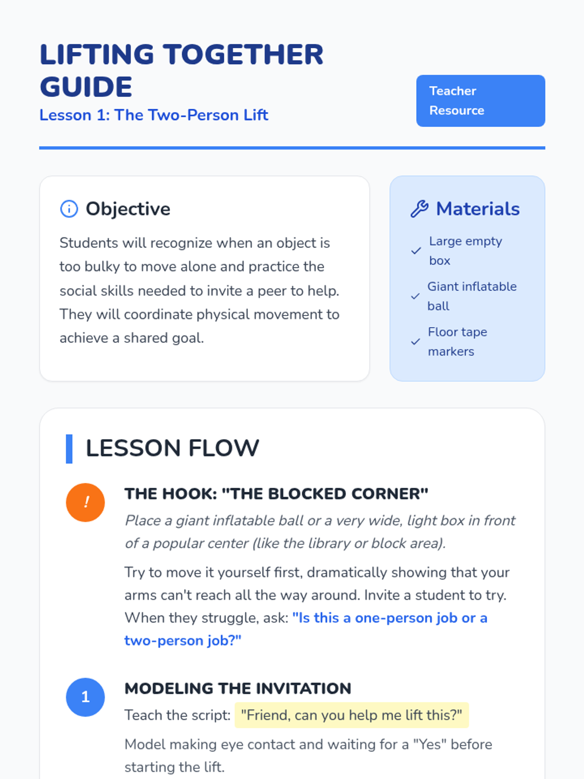 A Pre-K Special Education sequence focused on collaborative problem-solving. Students learn to work in pairs to overcome physical and communication-based obstacles through games, role-play, and hands-on tasks.
