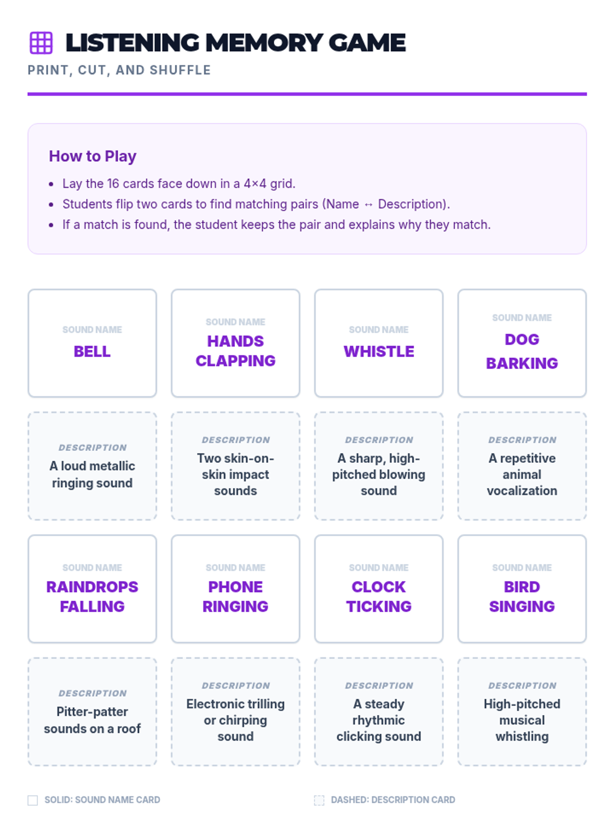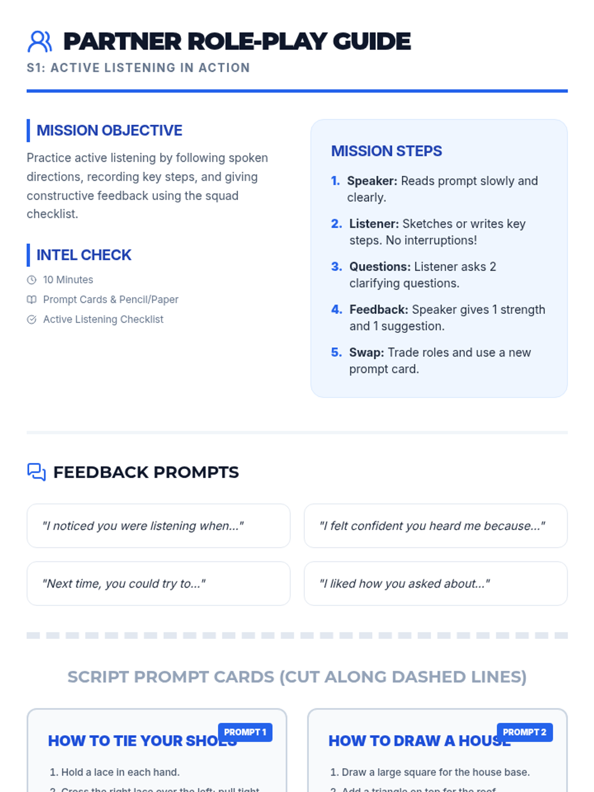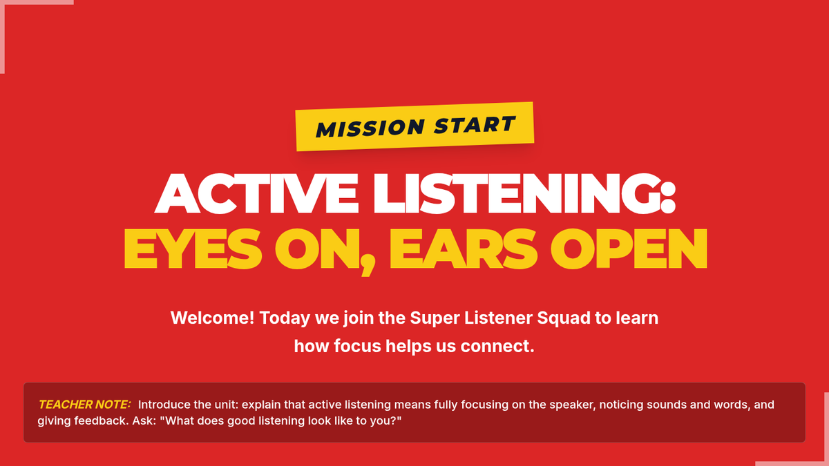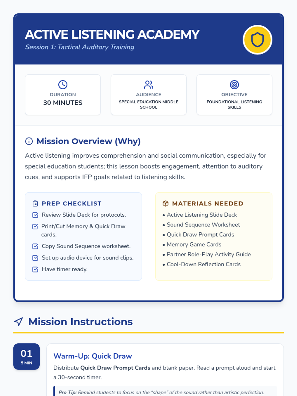 A 5-session unit designed for middle school special education students to develop foundational listening skills, including active listening, paraphrasing, tone detection, and following multi-step directions. through interactive games and structured practice.