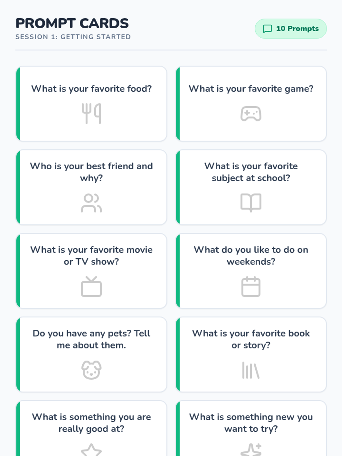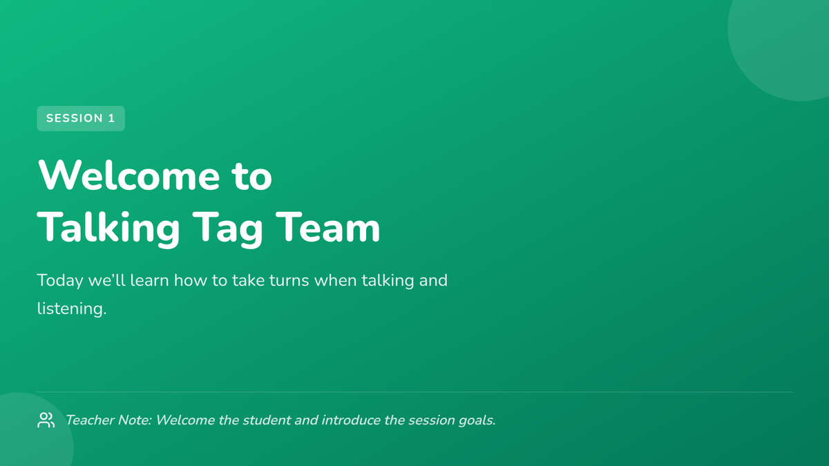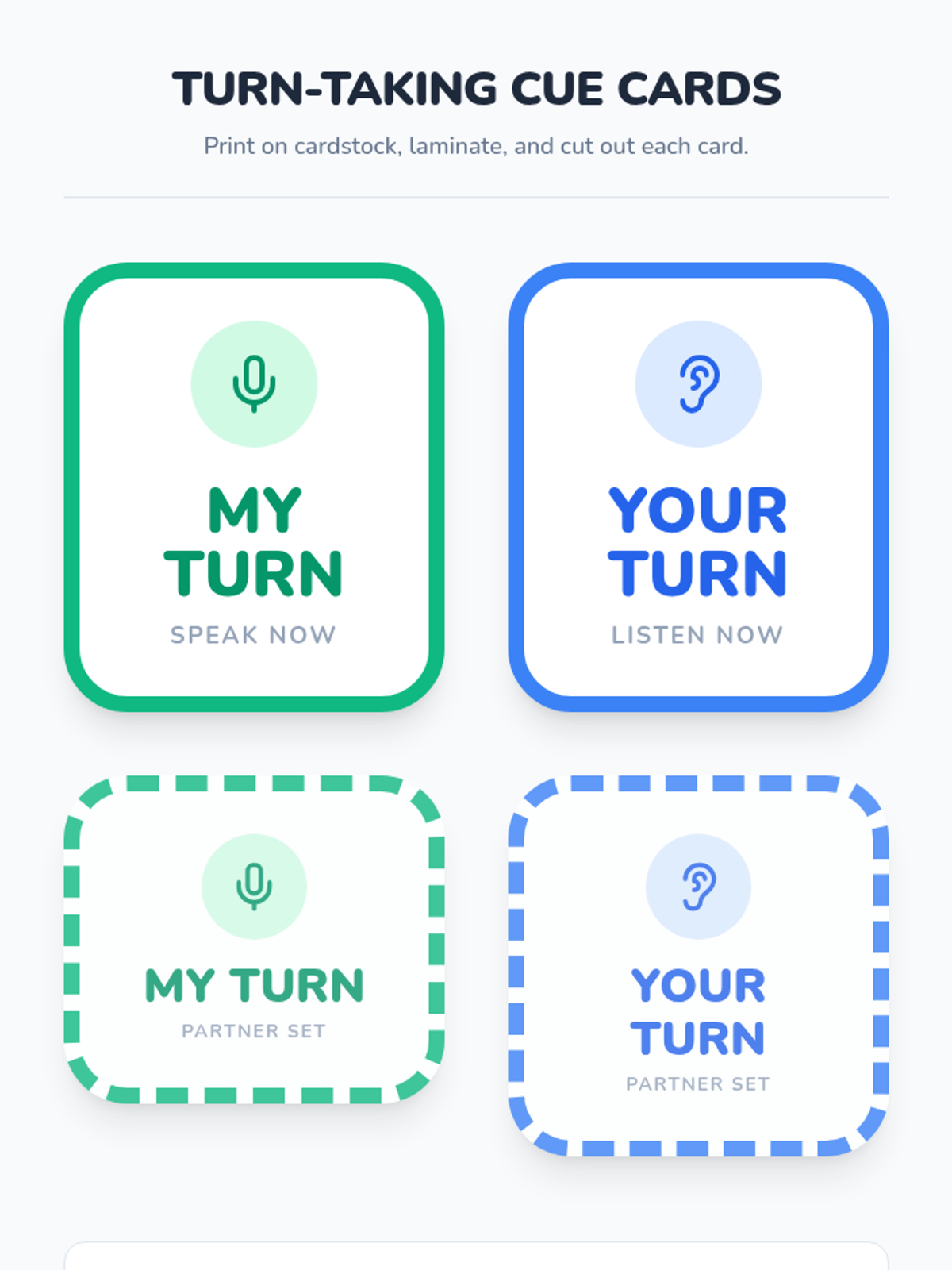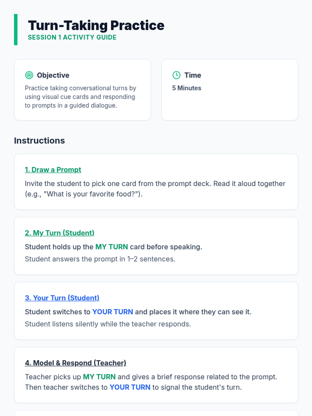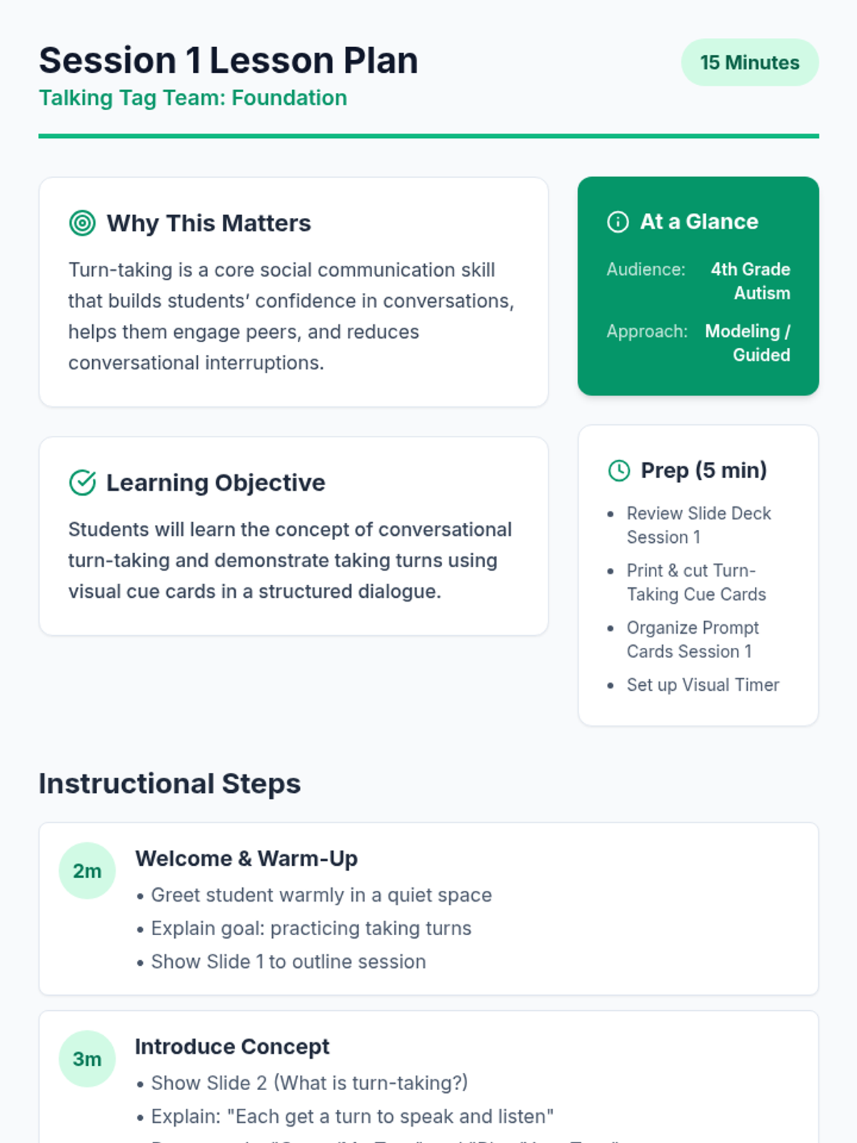 A three-session conversational turn-taking program for 4th-grade students with Autism, focusing on visual cues, extended dialogue, and follow-up questions.