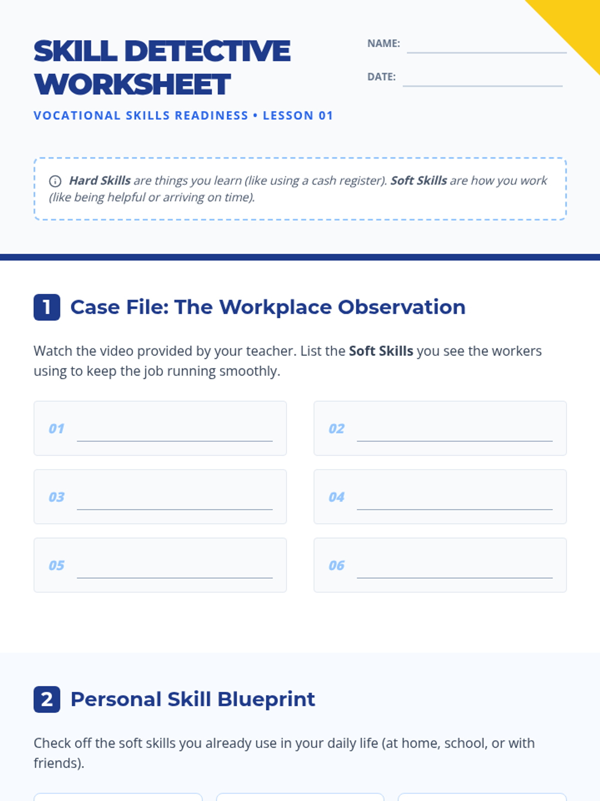 A comprehensive unit designed for high school life skills students with intellectual disabilities to distinguish between hard (technical) and soft (interpersonal) job skills through visual aids and interactive sorting activities.