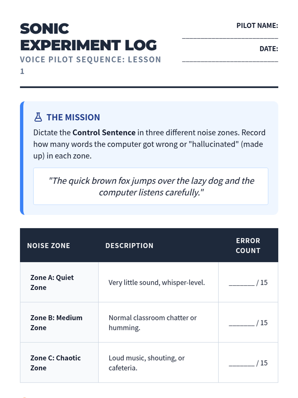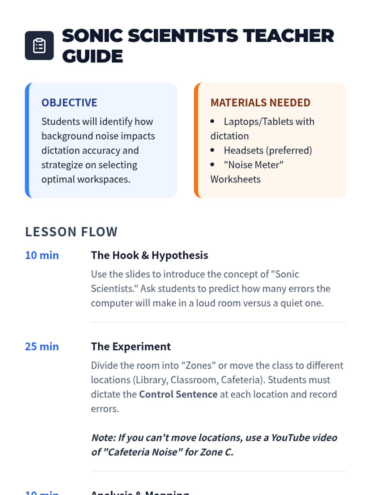 This sequence empowers 5th-grade students to master their environment and advocate for their assistive technology needs. Students move beyond basic software use to analyze noise levels, troubleshoot hardware issues, practice social etiquette, and design their ideal workspace for speech-to-text success.