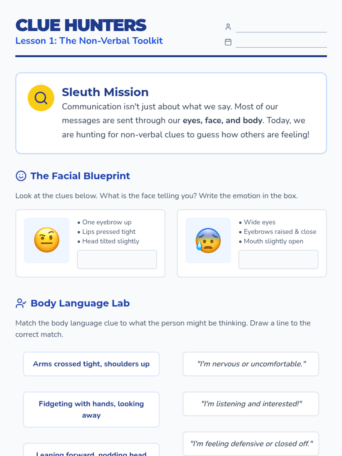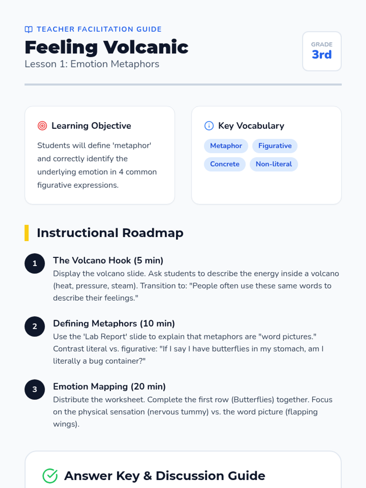 A comprehensive sequence for 3rd-grade students to master non-literal language in social contexts. Students learn to decode emotion metaphors, use idioms appropriately in conversation, and apply repair strategies when communication breakdowns occur.