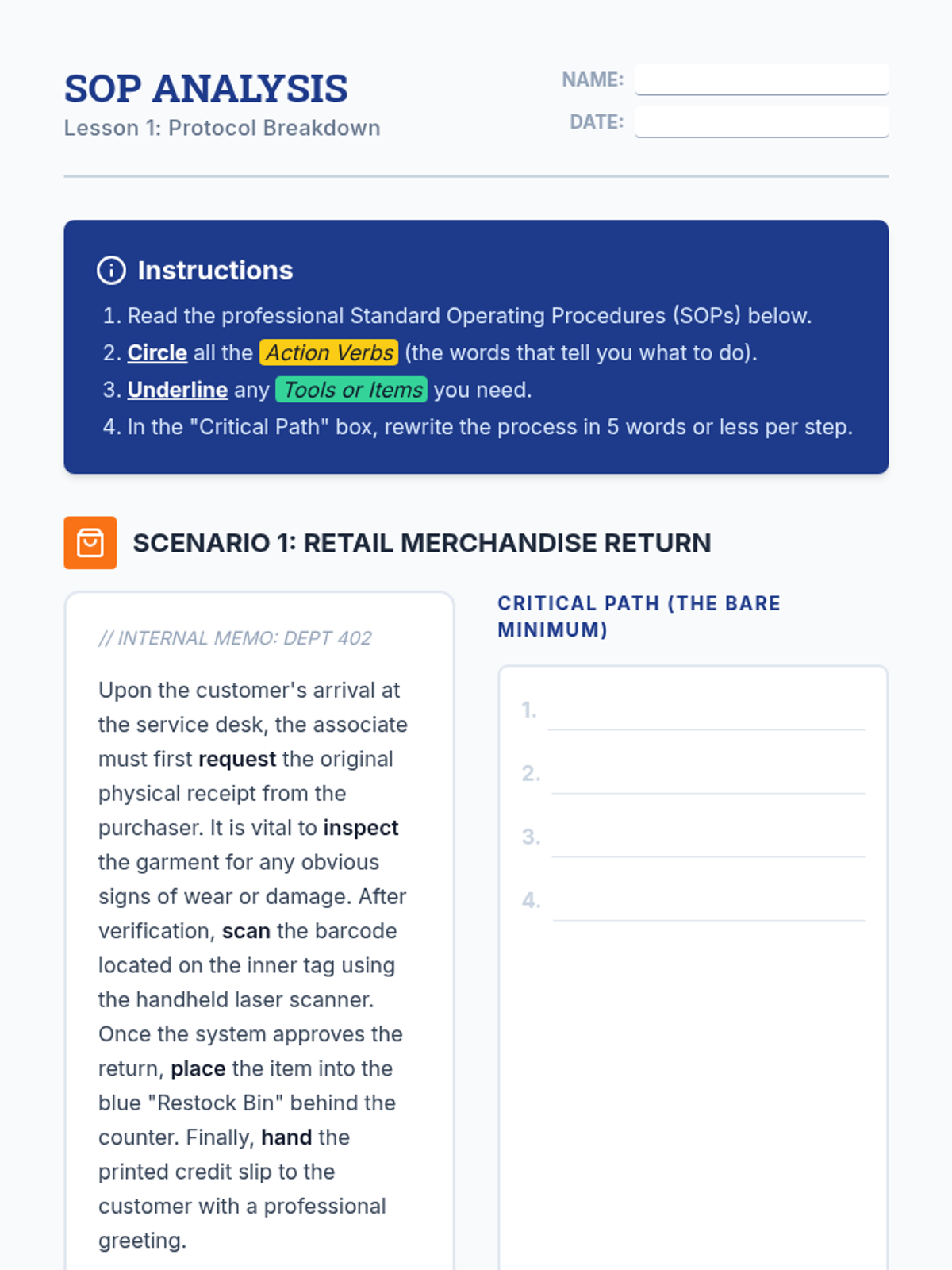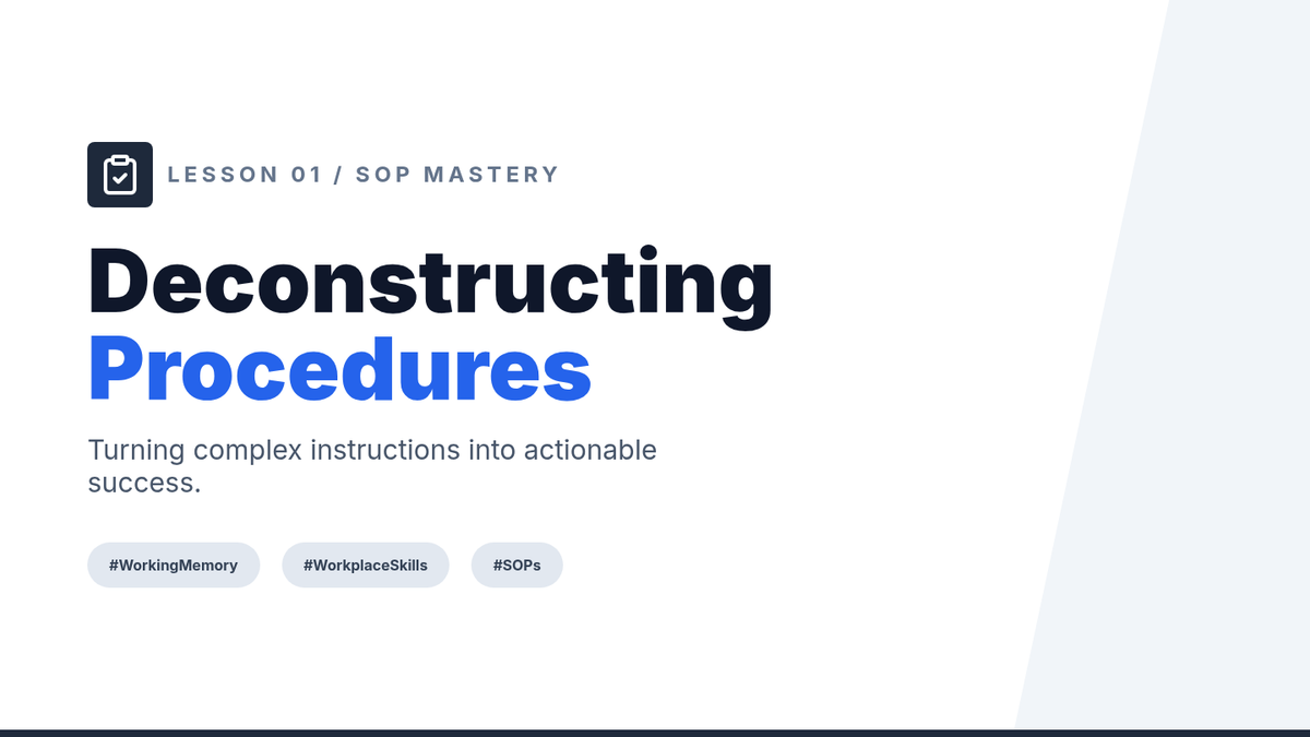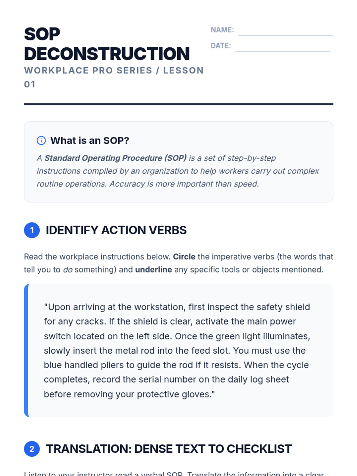 A comprehensive 5-lesson sequence designed for 12th-grade special education students to master workplace procedural accuracy. Students learn to deconstruct SOPs, use communication loops, chunk auditory information, visualize workflows, and manage multi-step tasks in high-pressure simulations.