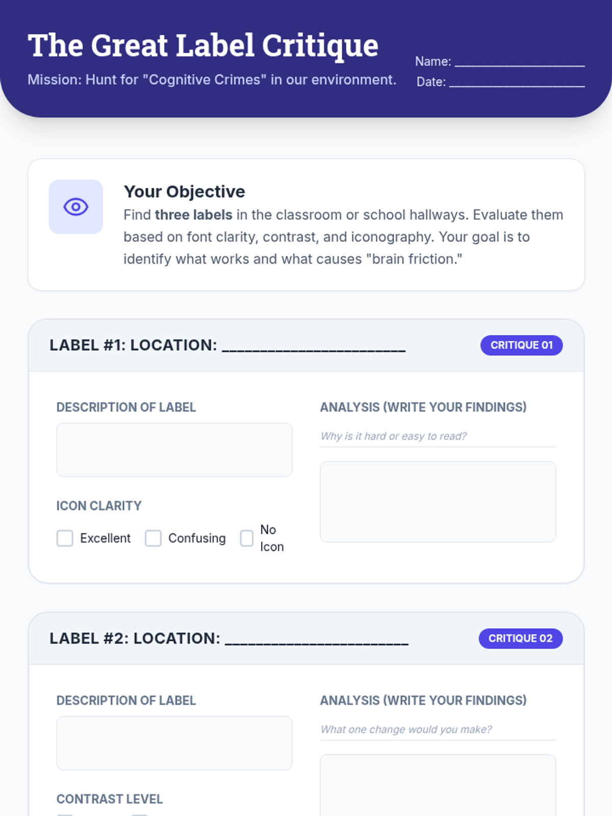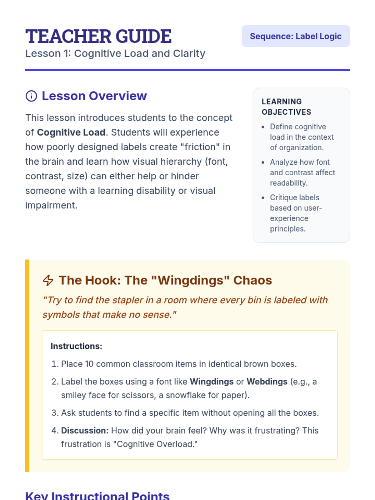 A comprehensive sequence for 11th-grade students focusing on the design, psychology, and fabrication of visual organizational supports. Students learn to reduce cognitive load through effective visual hierarchy, standardized systems, and durable material creation.