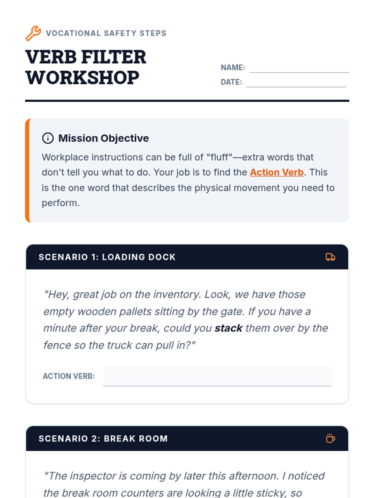 A vocational training sequence for 11th-grade students focusing on working memory through single-step directions in workplace safety contexts. Students practice interpreting signs, filtering auditory distractions, and following strict protocols in high-stakes simulations.