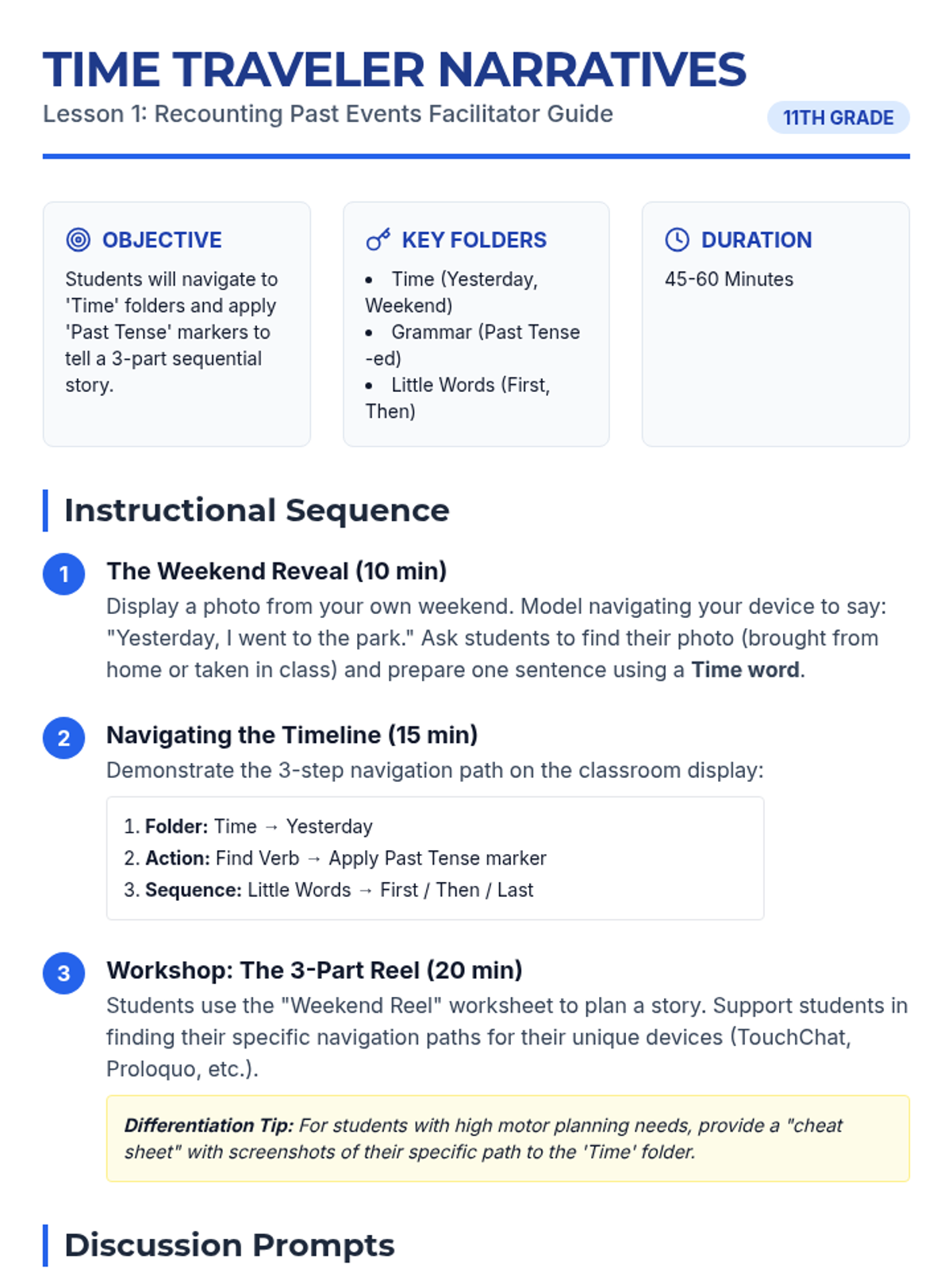 A specialized sequence for 11th-grade AAC users focused on transitioning from basic needs-based communication to complex social interaction, storytelling, and peer connection through advanced device navigation.