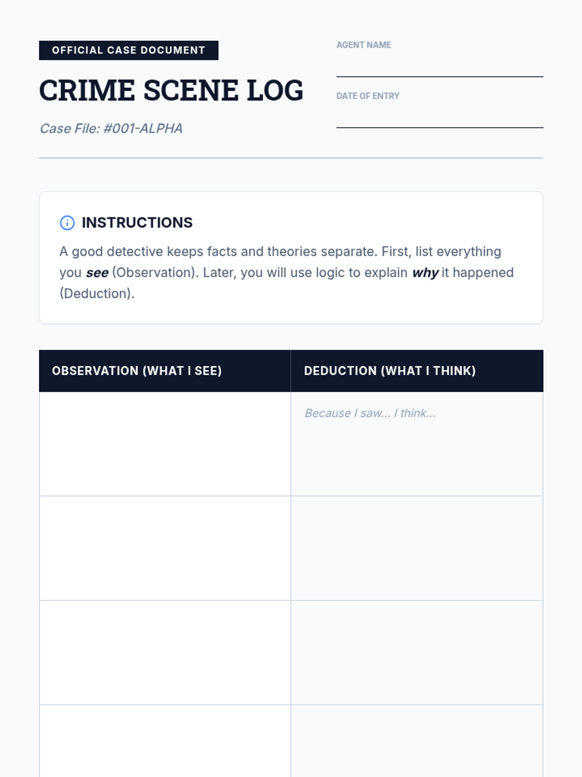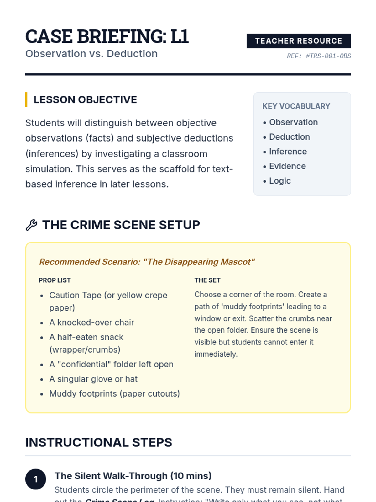 This 9th-grade Special Education sequence uses a 'detective' theme to teach inference and prediction. Students move from concrete observations of a 'crime scene' to analyzing witness bias, synthesizing multiple data points, and constructing evidence-based arguments (CER) to solve a fictional mystery.