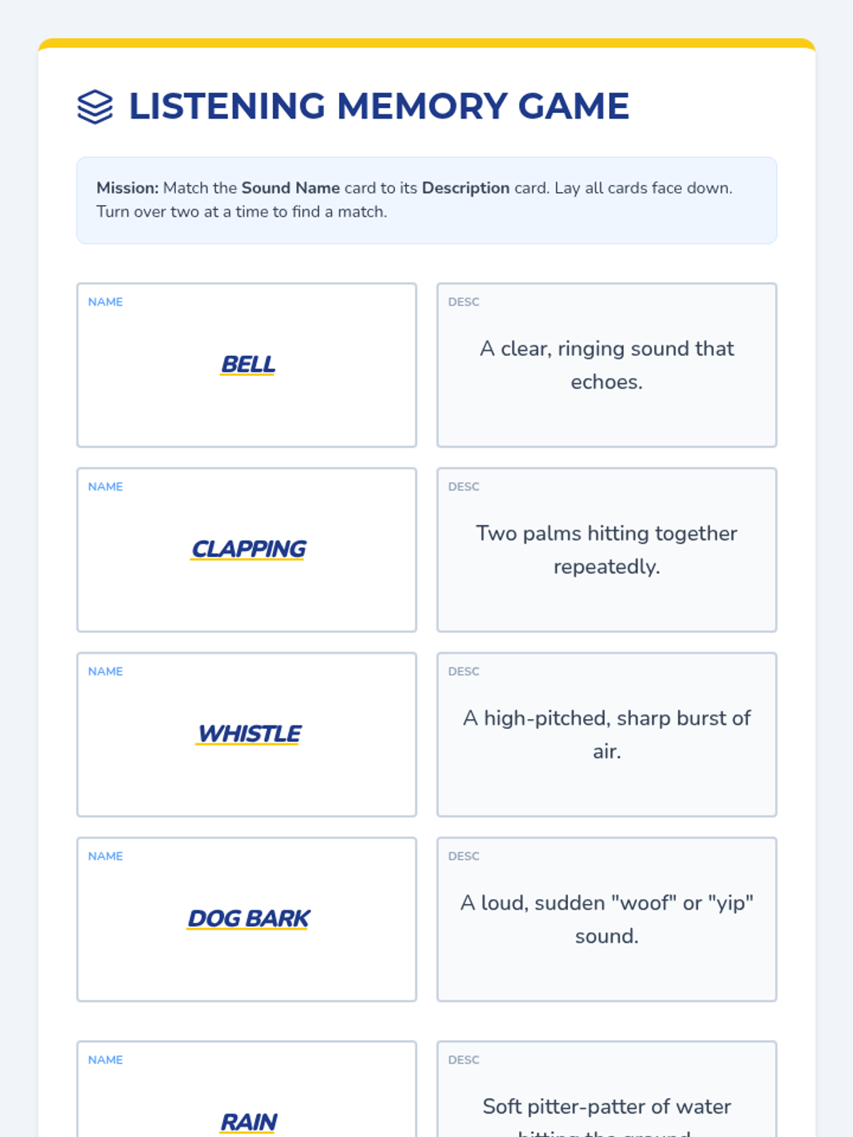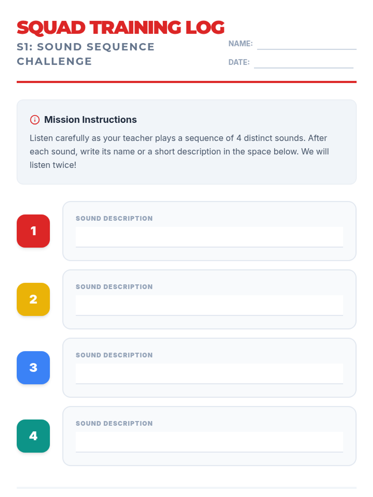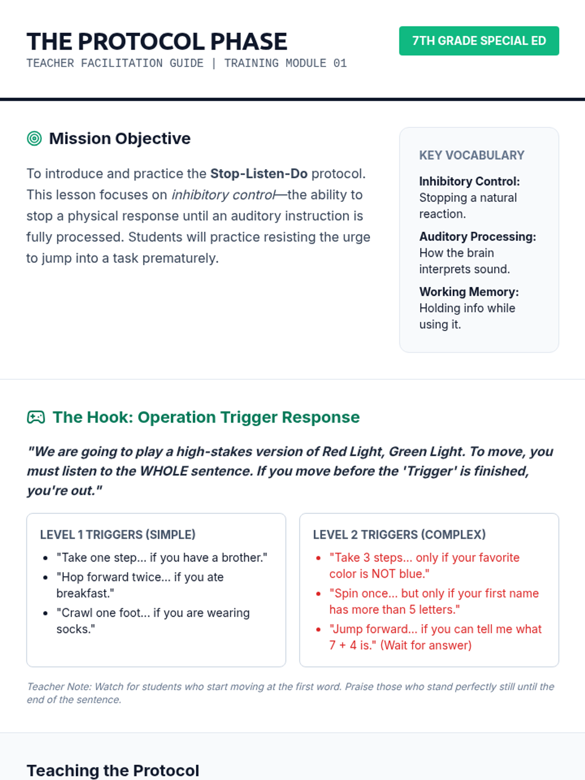 A 5-lesson series designed for 7th-grade students to build auditory working memory and inhibitory control. Students progress through gamified challenges that emphasize processing single-step directions, filtering verbal information, and advocating for clarity.