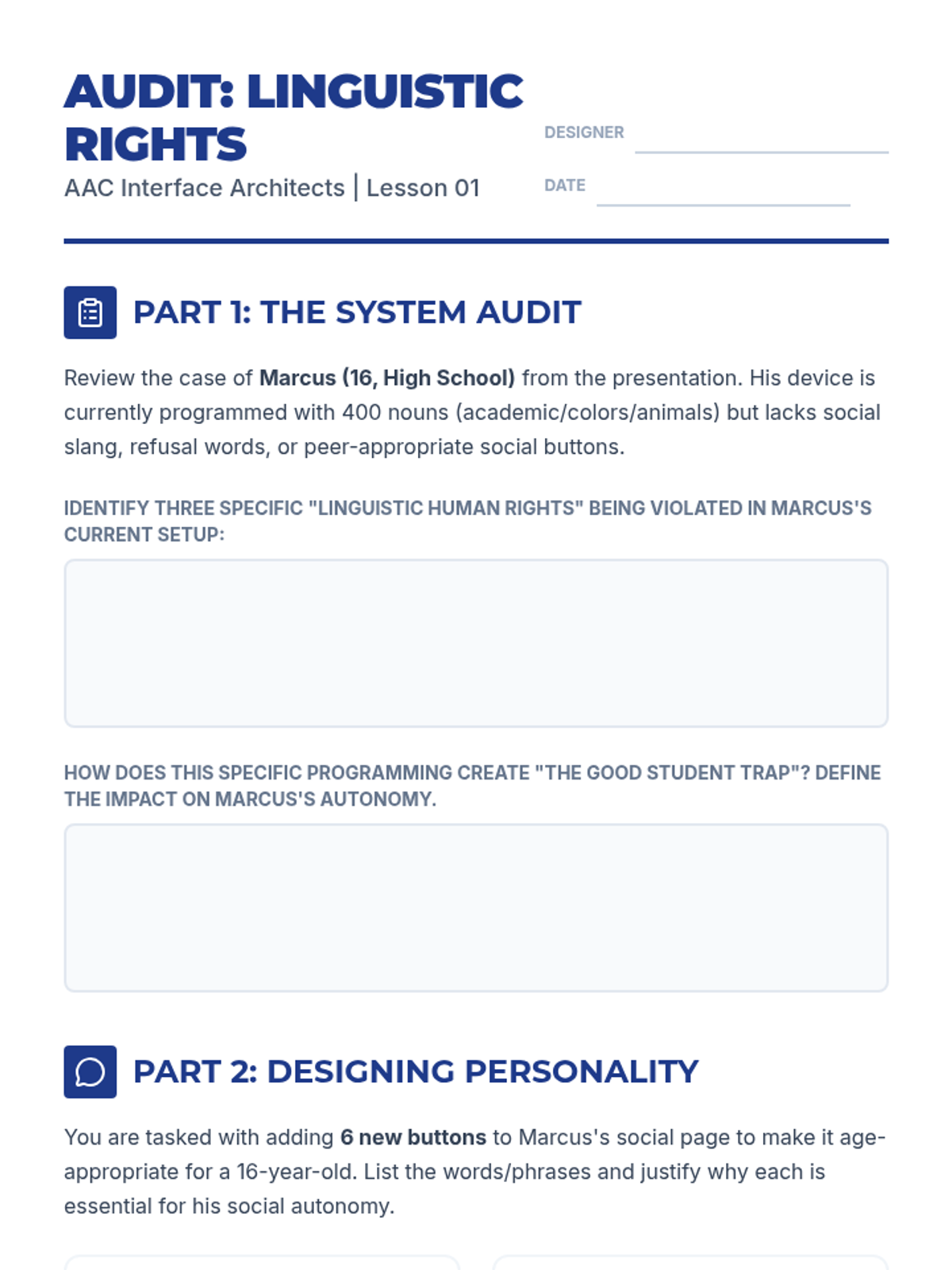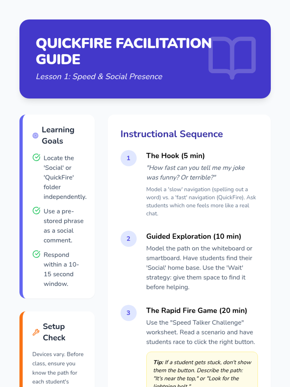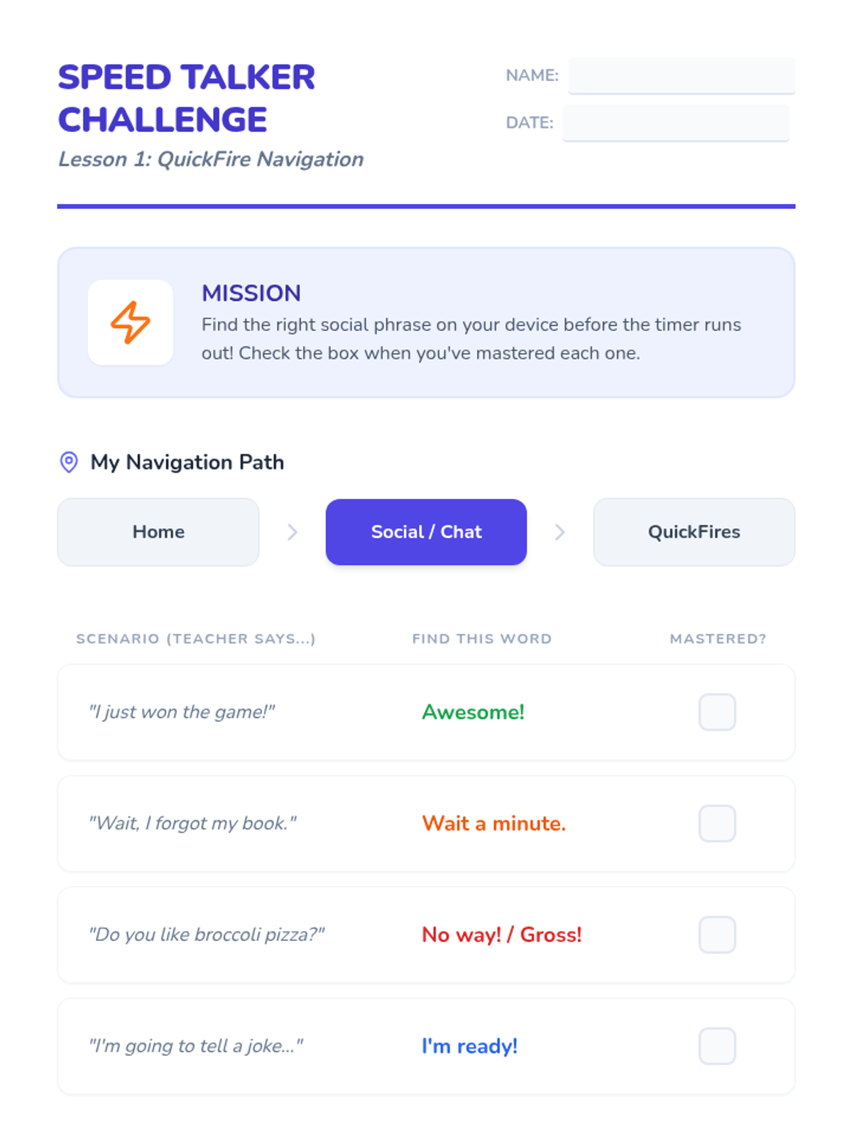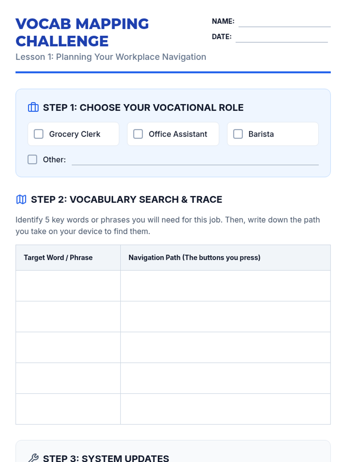 A comprehensive 5-lesson sequence designed for 11th-grade AAC users to master device navigation within vocational settings. Students progress from vocabulary mapping to high-stakes workplace simulations, focusing on speed, accuracy, and professional communication strategies.
