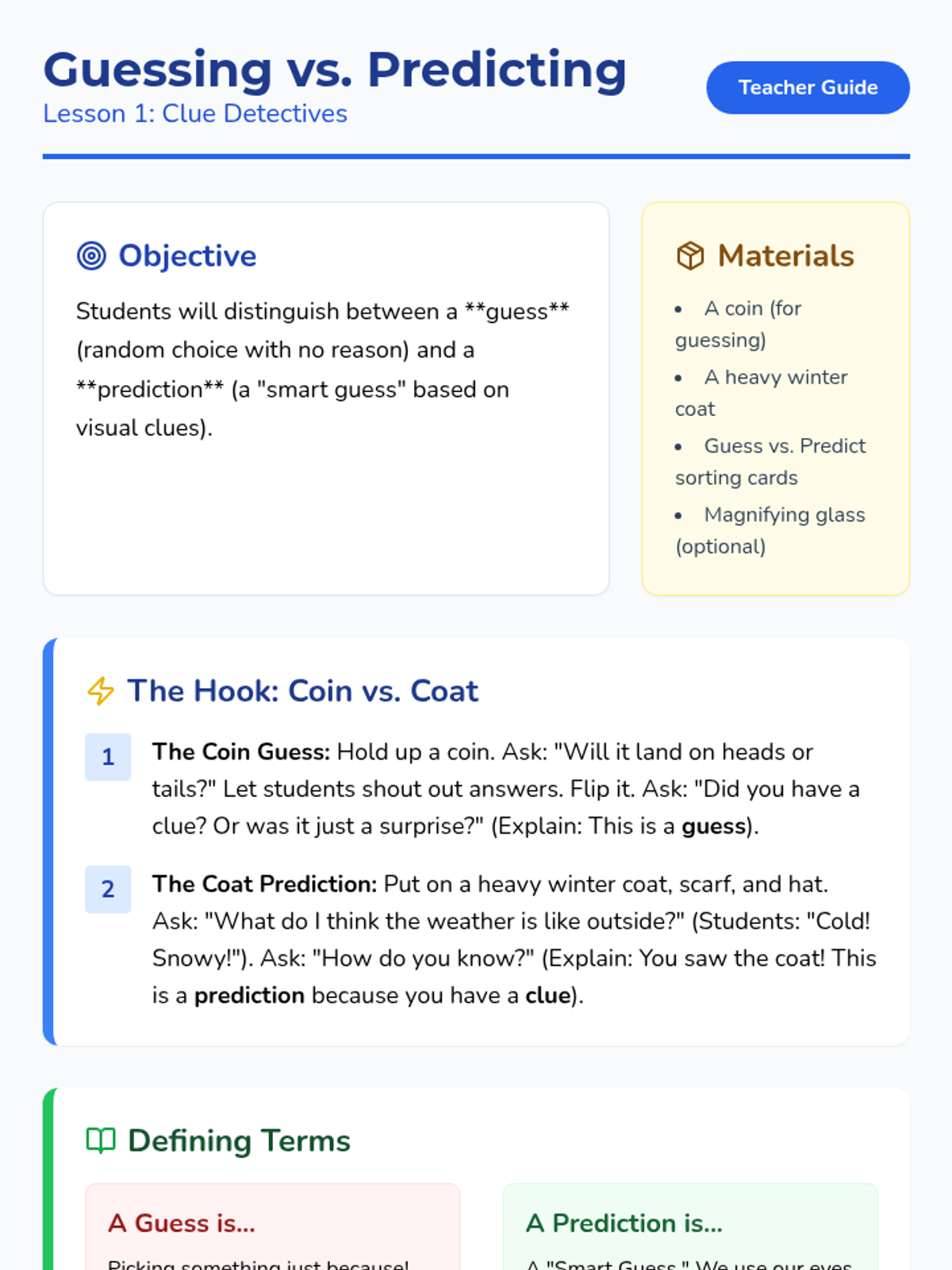 A Kindergarten sequence focused on teaching special education students how to make predictions using the 'because' bridge to connect thoughts to evidence. Students transition from wild guessing to substantiated predictions using visual aids and sentence frames.