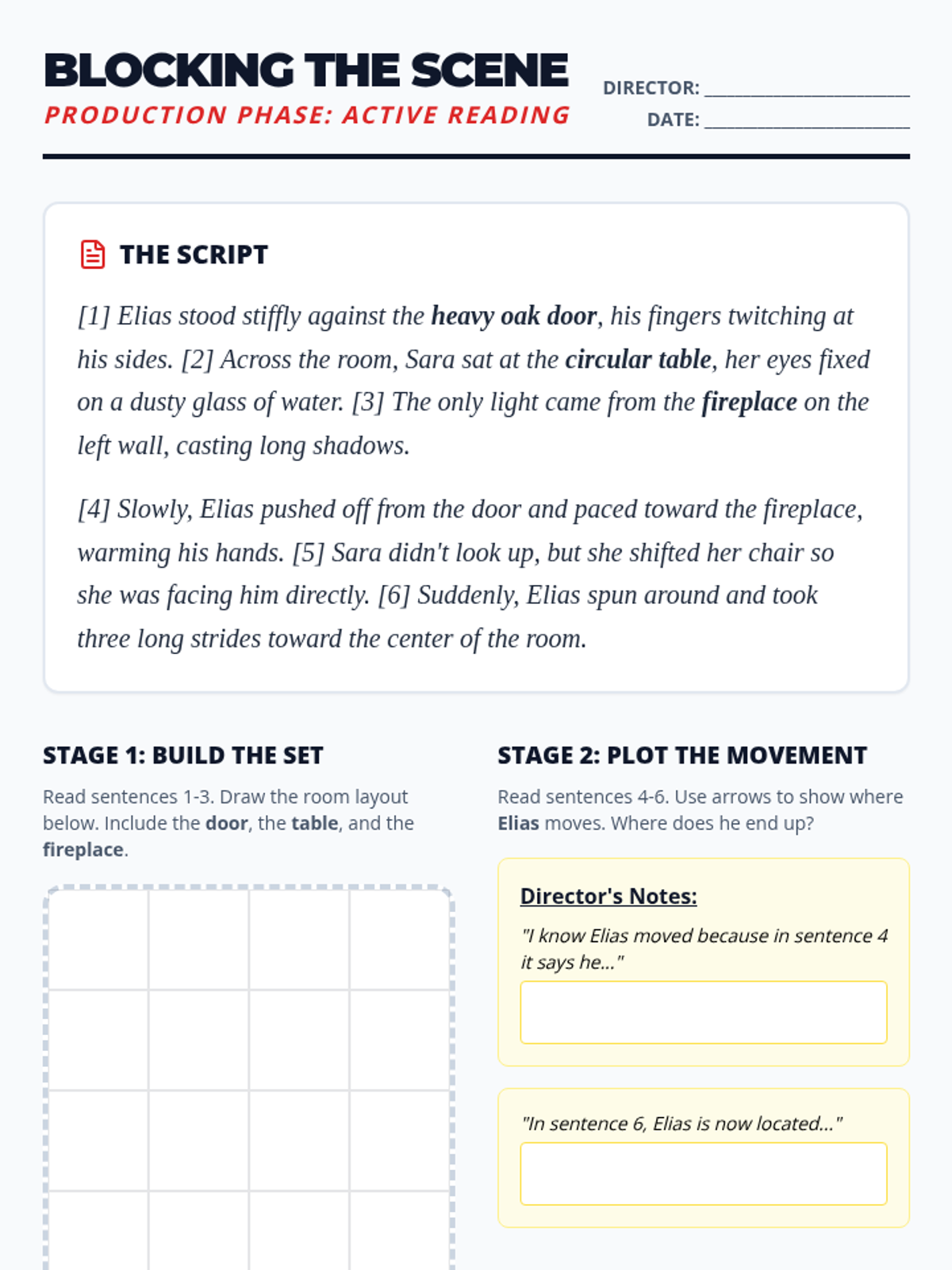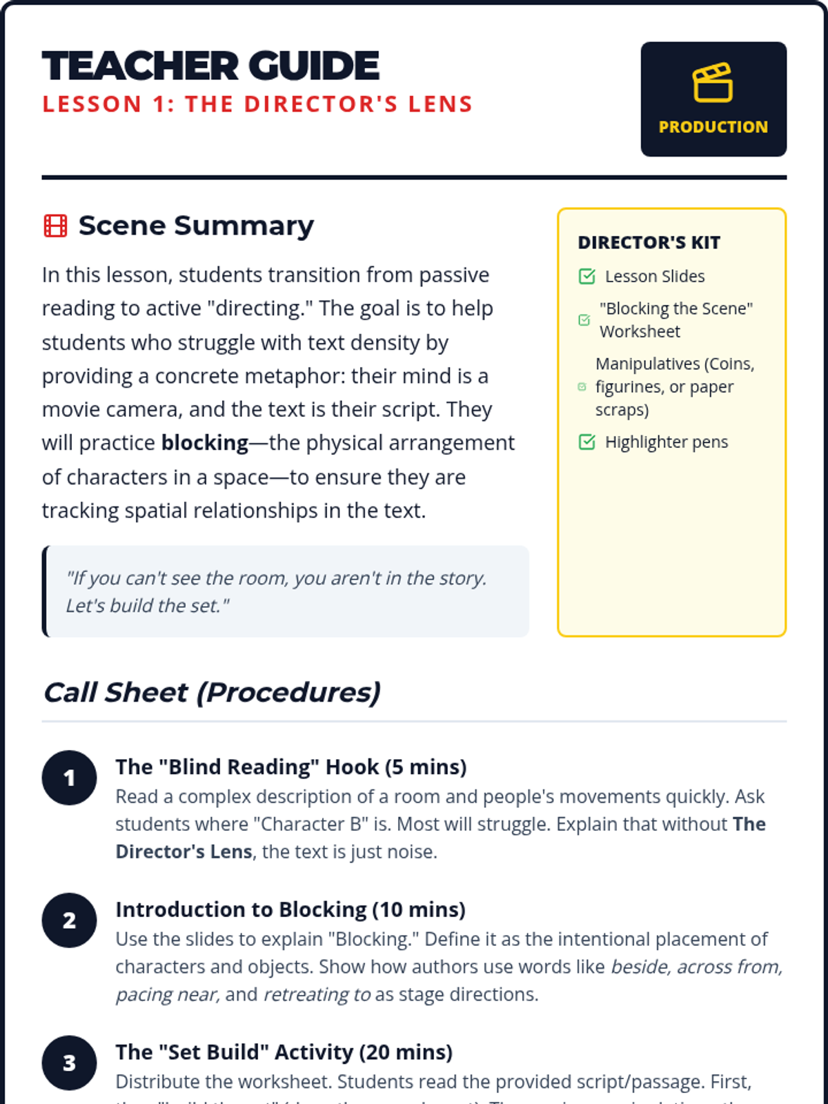 A specialized literacy sequence for 12th-grade students focused on using visualization strategies to decode and analyze complex narrative texts. Students adopt the persona of film directors to translate descriptive language into vivid mental imagery, enhancing comprehension, memory retention, and inference skills.