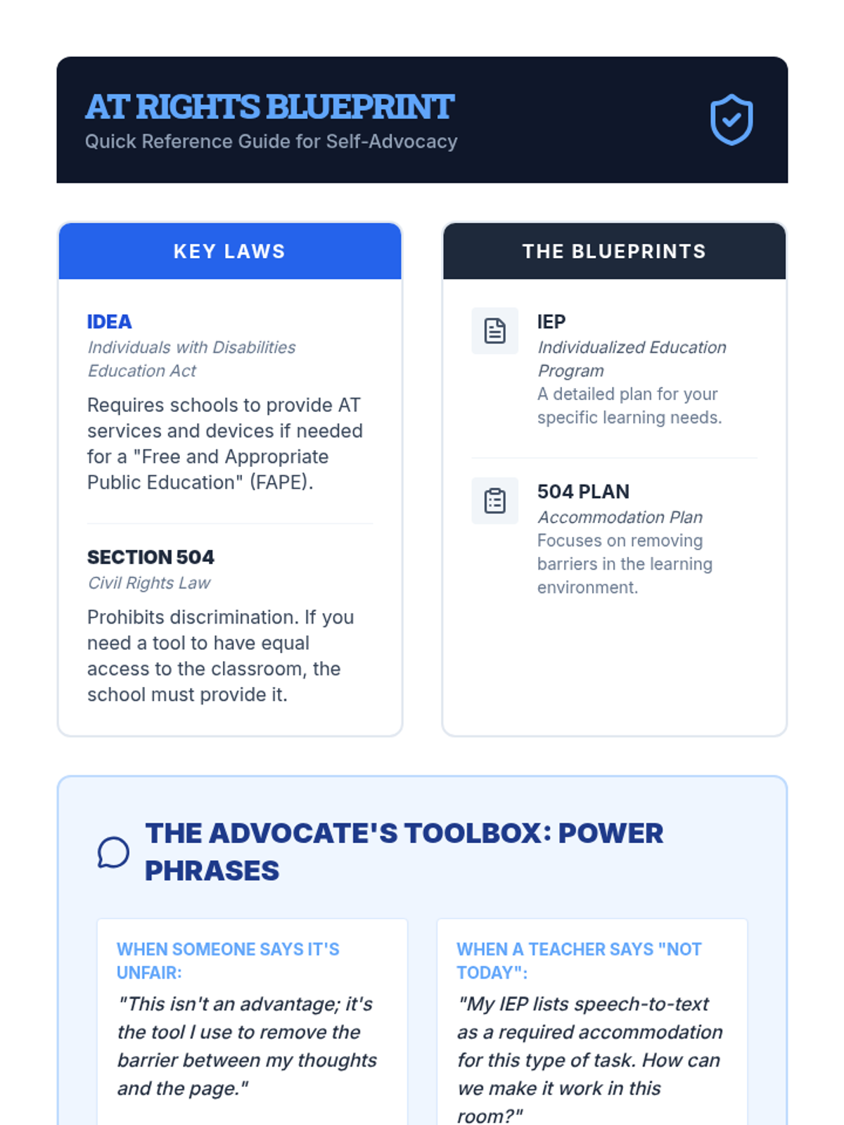 A 5-lesson unit for 9th-grade students focusing on the self-advocacy skills needed to use speech recognition technology effectively in academic and professional environments. Students learn about their legal rights, practice social navigation, and create professional materials to communicate their accommodation needs to instructors.