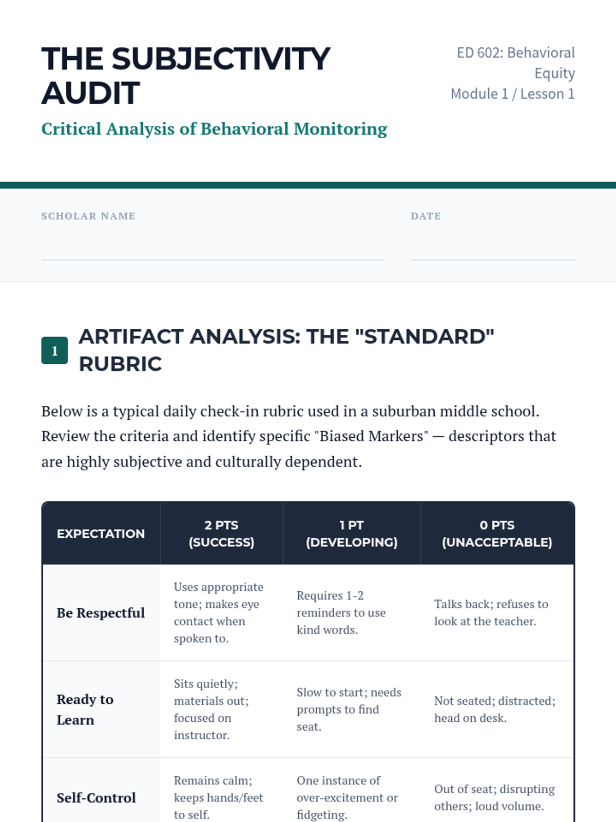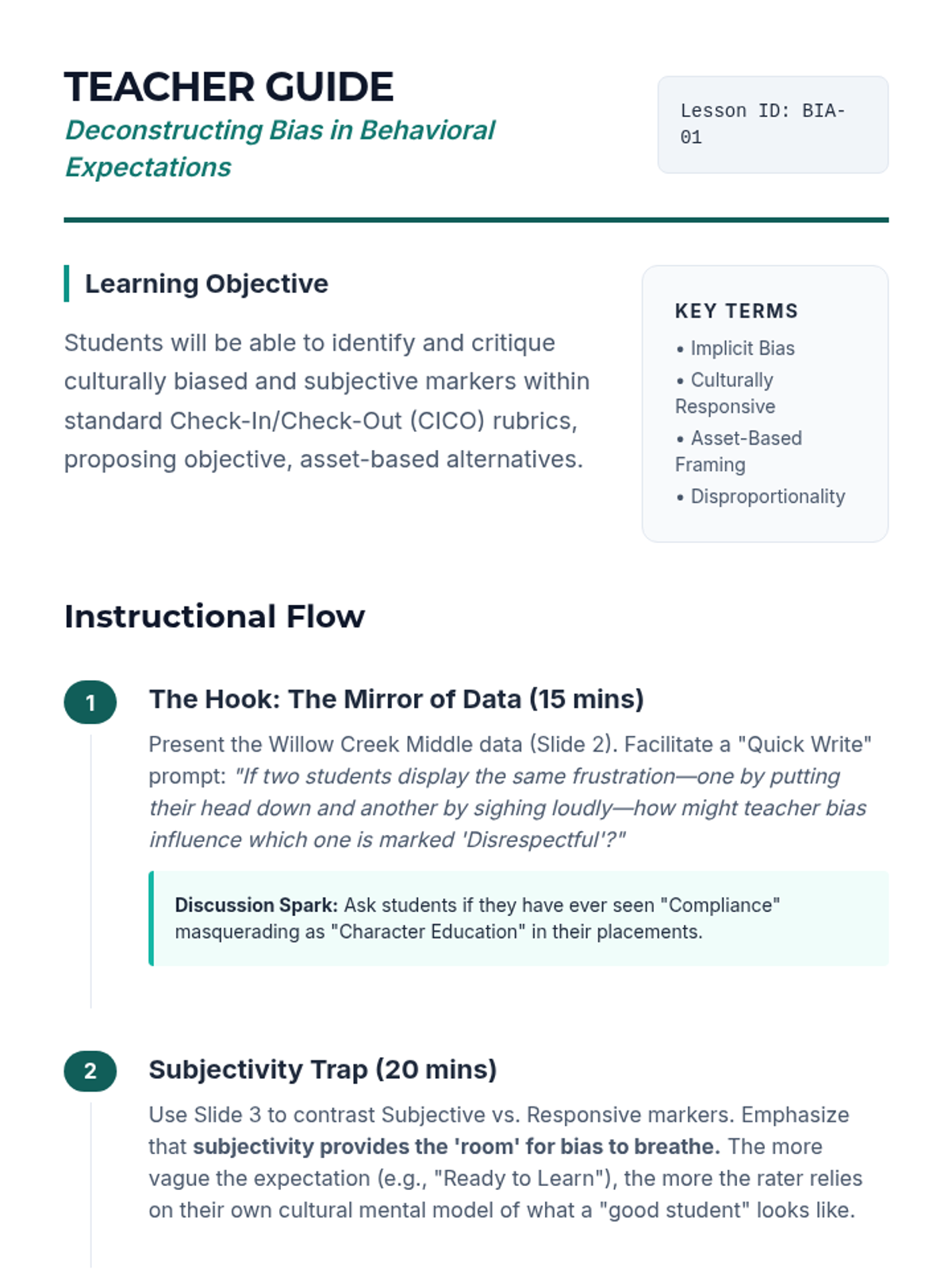 A graduate-level sequence focused on interrogating and redesigning behavioral check-in procedures through a lens of cultural responsiveness and equity. Students will move from deconstructing implicit bias to designing asset-based, family-engaged systems.