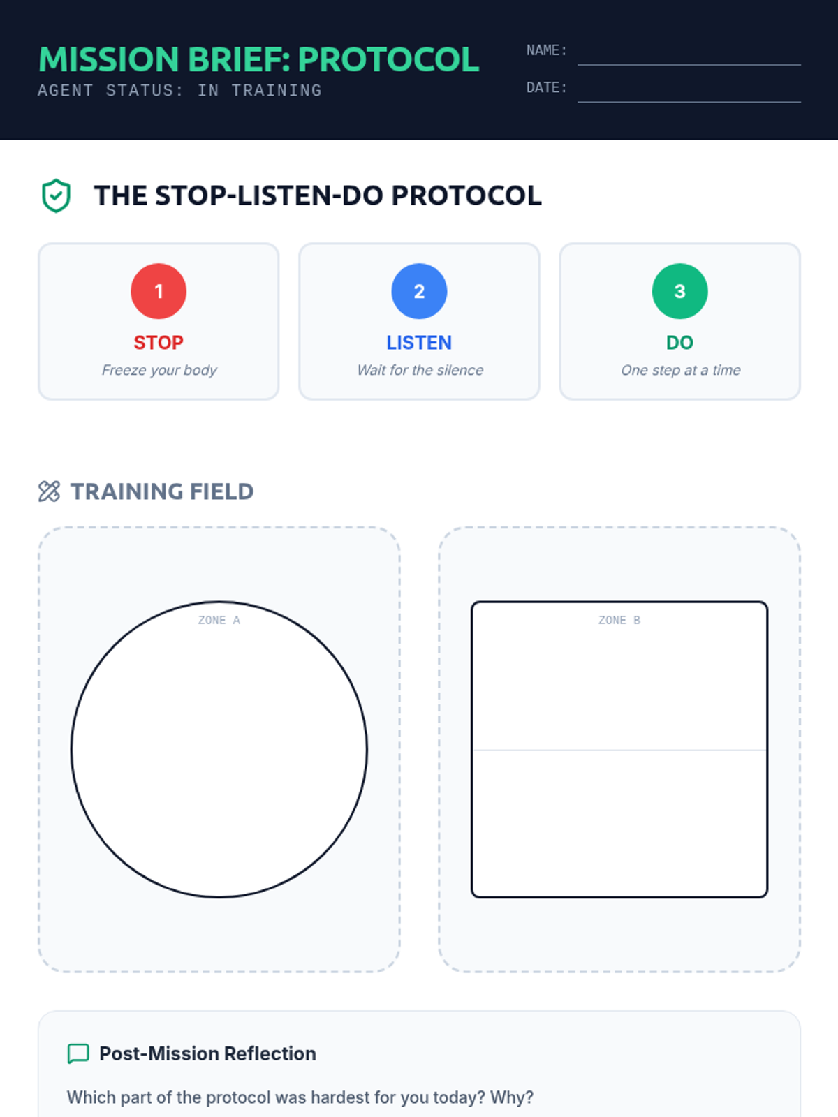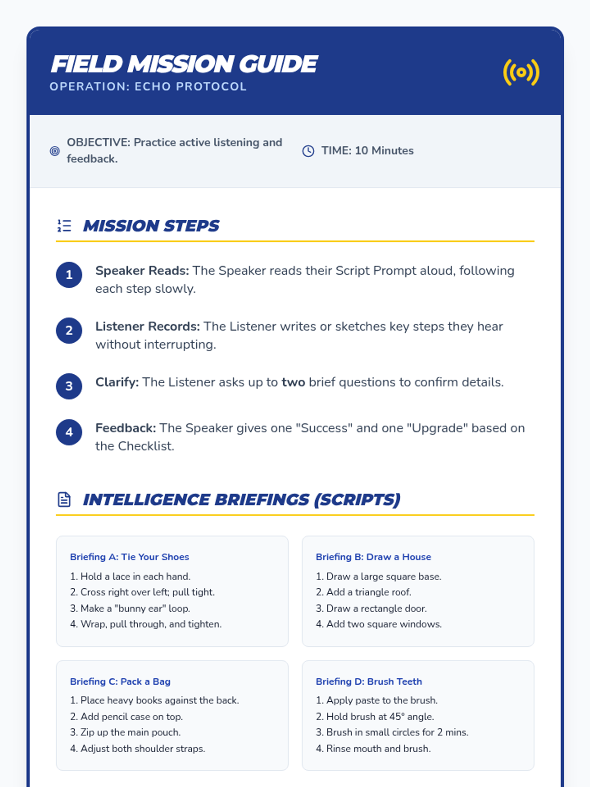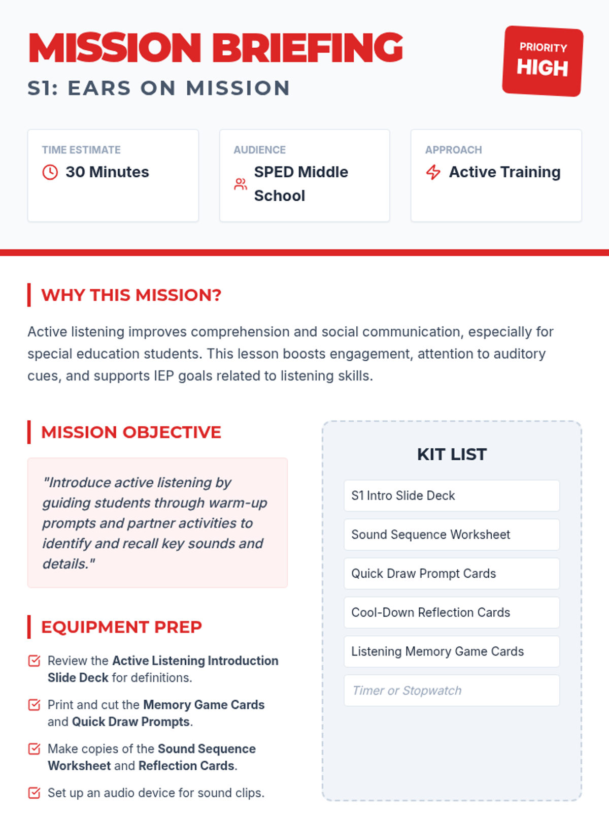 A 5-session unit for middle school special education students to build active listening, paraphrasing, tone detection, and multi-step direction skills through a secret agent training theme.