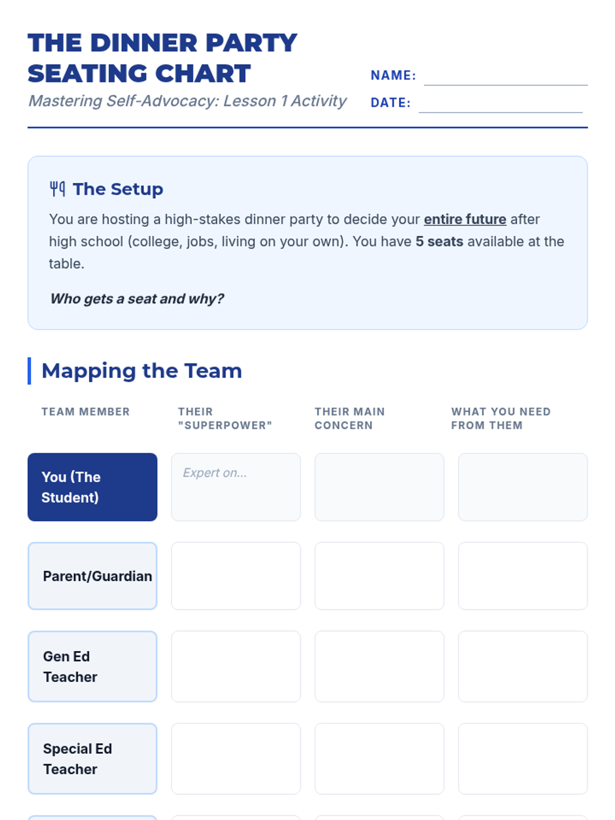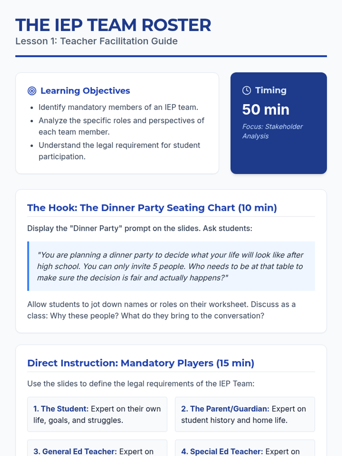 A comprehensive unit designed to empower 10th-grade students to lead their own IEP meetings. Students transition from passive attendees to active facilitators by learning team roles, preparing evidence-based summaries, practicing professional communication, and simulating the meeting process.