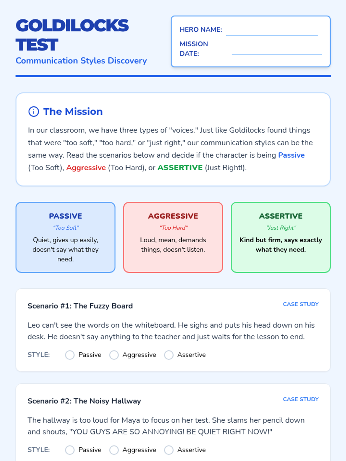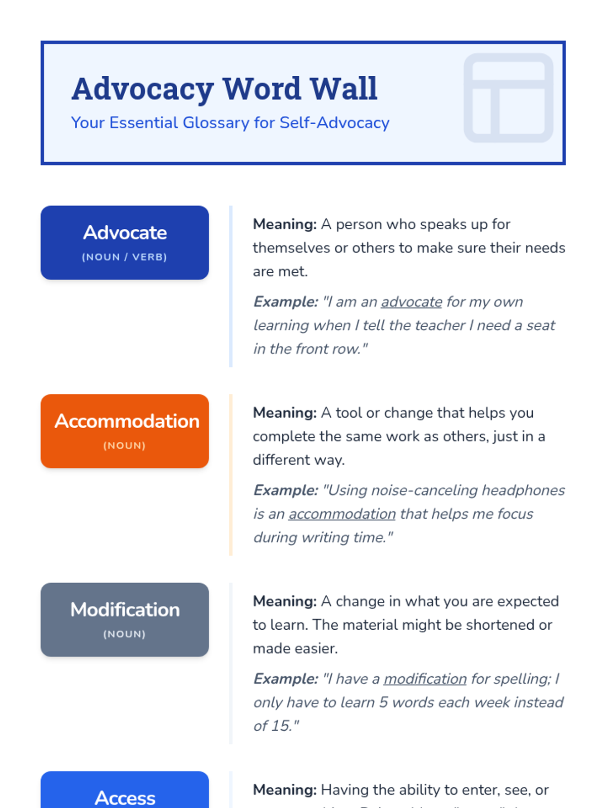 A sequence designed to empower 3rd-grade students with the verbal and social skills needed to advocate for their IEP or 504 supports respectfully and effectively. Students will learn to distinguish between communication styles, construct effective request scripts, and handle various responses from adults.