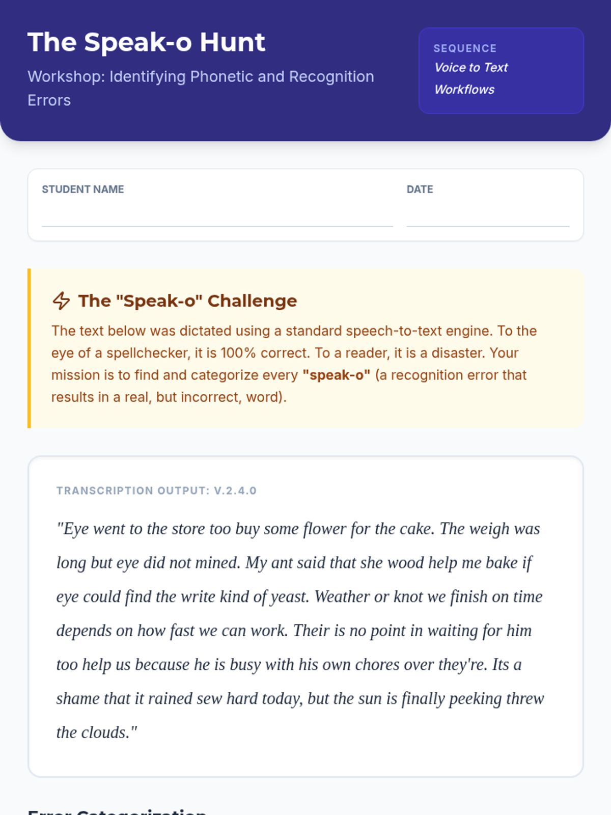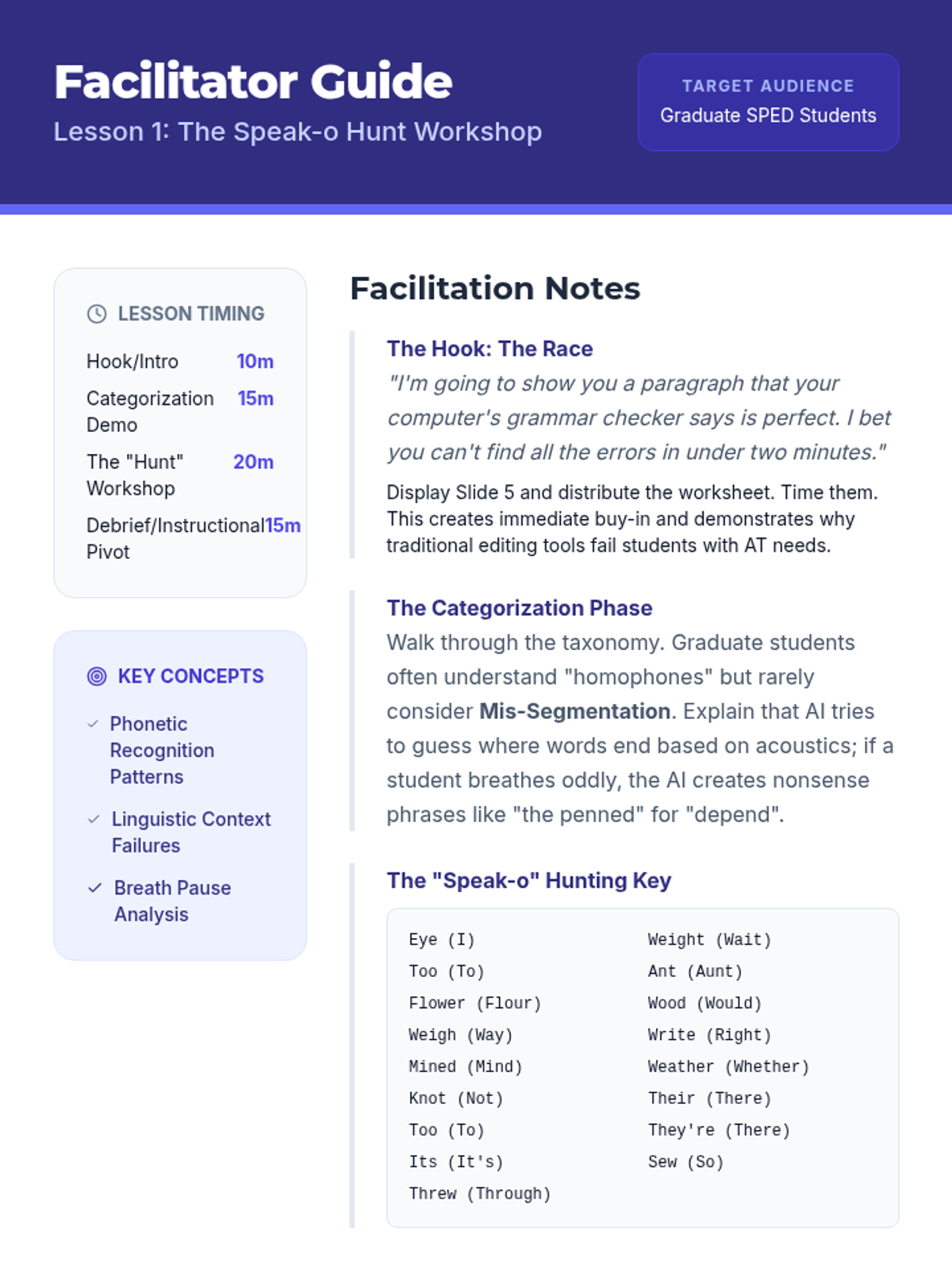 This project-based sequence prepares graduate students in Special Education to teach effective 'listen-read-edit' workflows for speech recognition technology. Participants move from identifying unique phonetic errors to designing instructional scaffolds and facilitating inclusive peer reviews for students with physical disabilities.