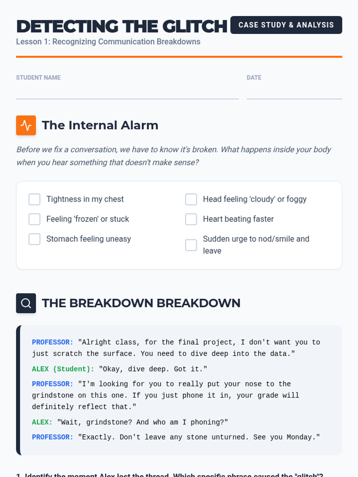 A 12th-grade social communication sequence focused on self-advocacy and repair strategies when encountering ambiguous or figurative language in real-world scenarios.