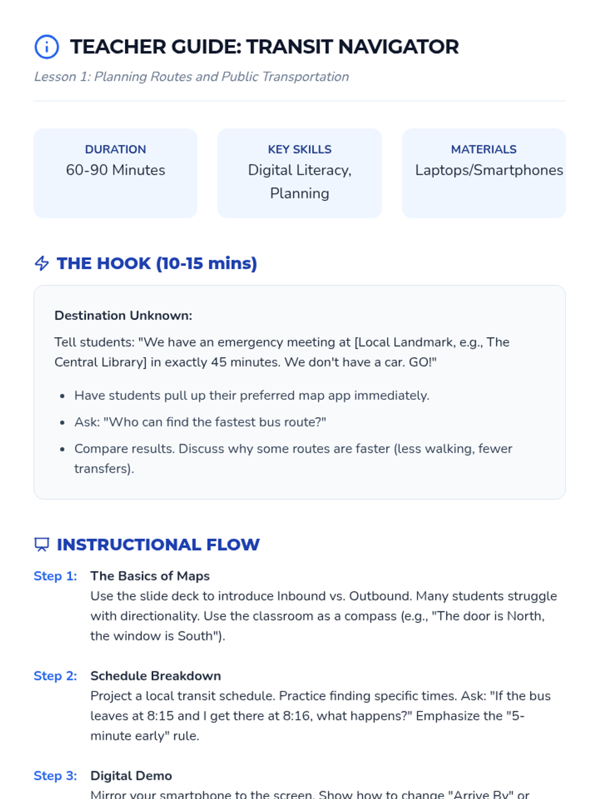 A comprehensive 5-lesson sequence for 9th-grade students focused on building independent living skills through safe community navigation, social boundaries, digital awareness, and emergency preparedness.