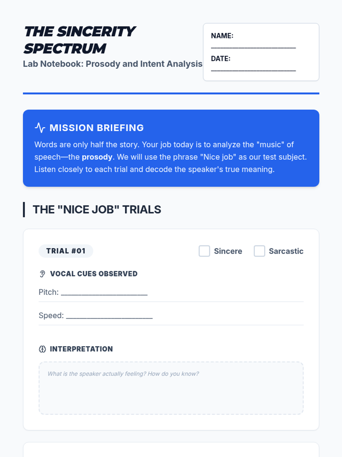 A specialized sequence for 10th-grade social communication students focused on detecting sarcasm and vocal nuance through paralinguistic cues and context analysis.