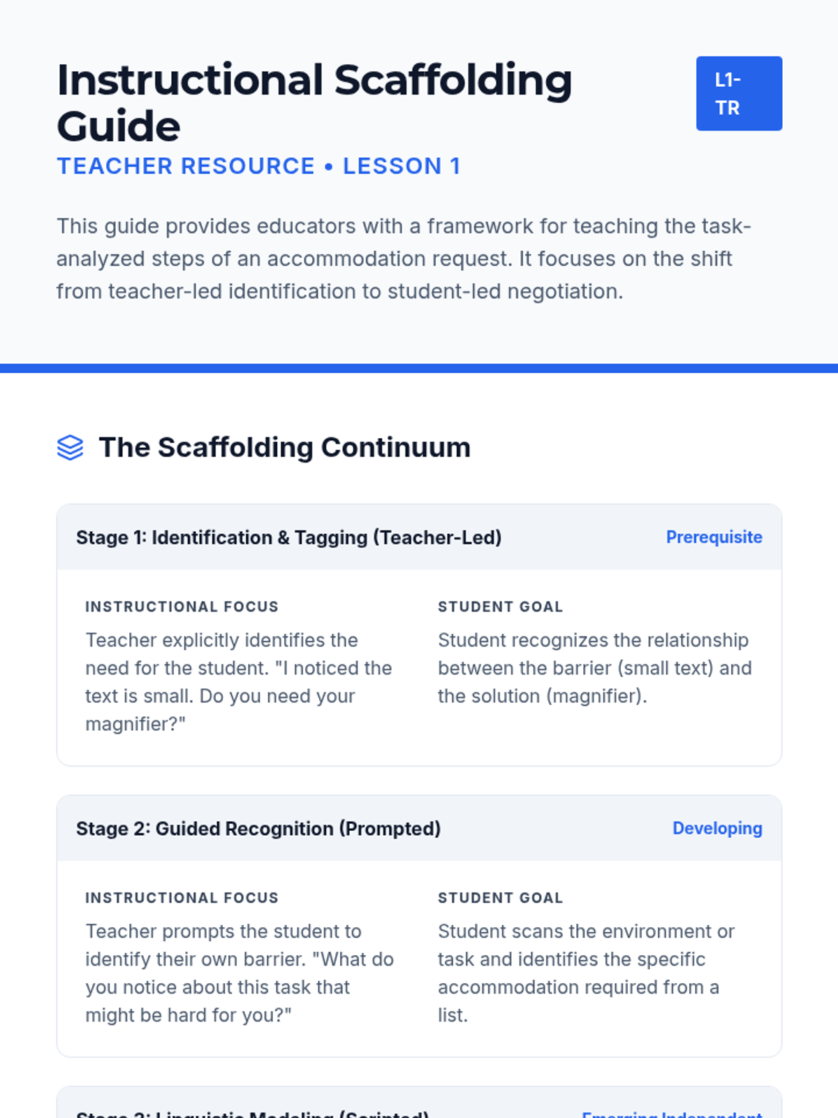 A 5-lesson sequence designed for 3rd-grade students to build the communication skills needed to request accommodations. Students move from defining self-advocacy to practicing scripts, understanding social timing, role-playing scenarios, and building resilience for when requests aren't immediately met.