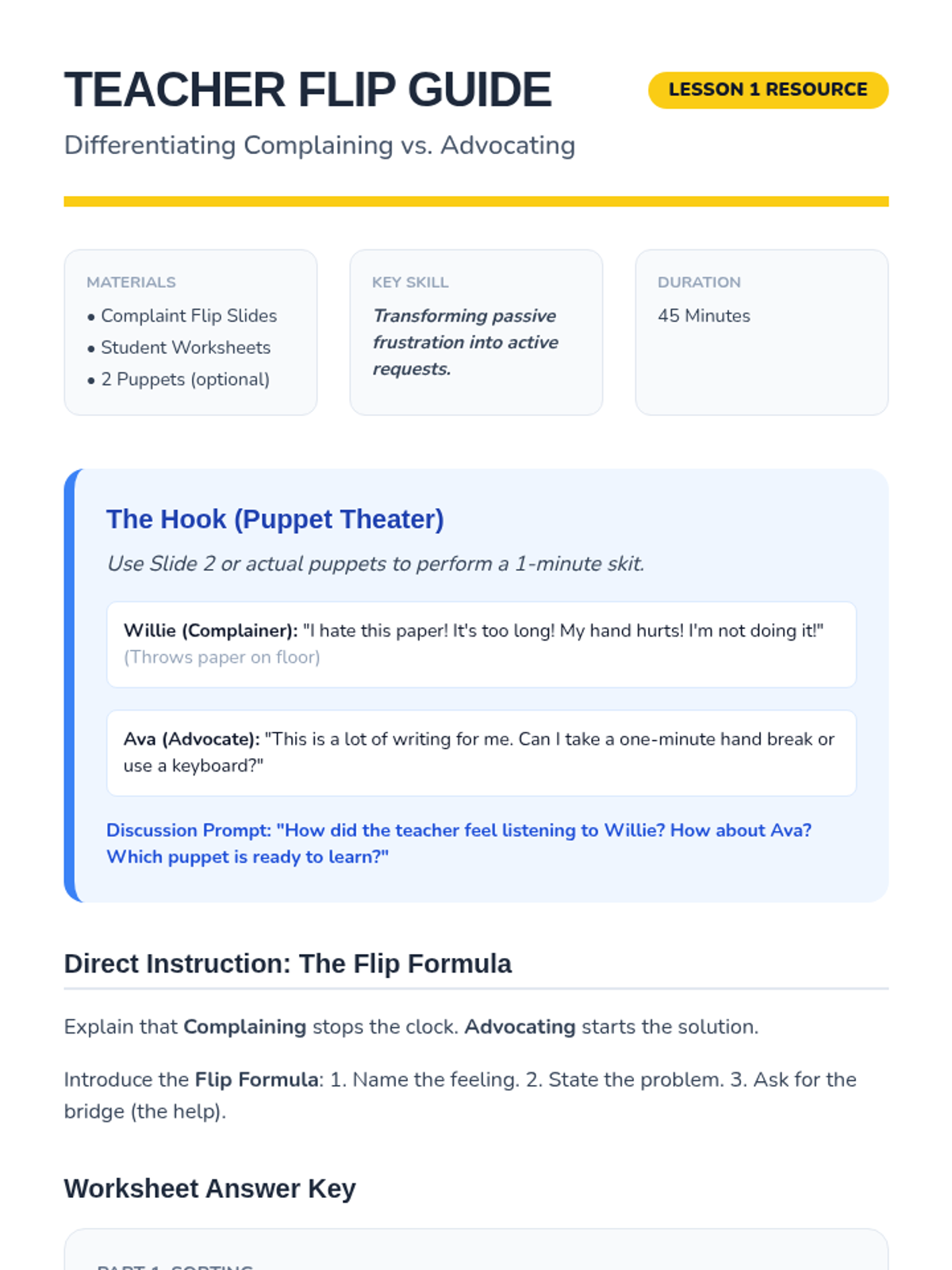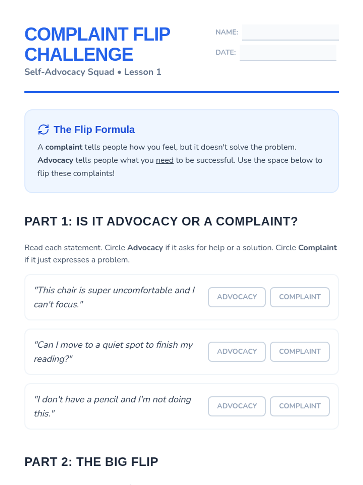 A 5-lesson sequence designed for 3rd-grade students to transition from general problem-solving to self-advocacy. Students learn to distinguish between complaining and advocating, identify appropriate sources of help, draft personal advocacy scripts, and create a physical 'Help Menu' tool for daily use.