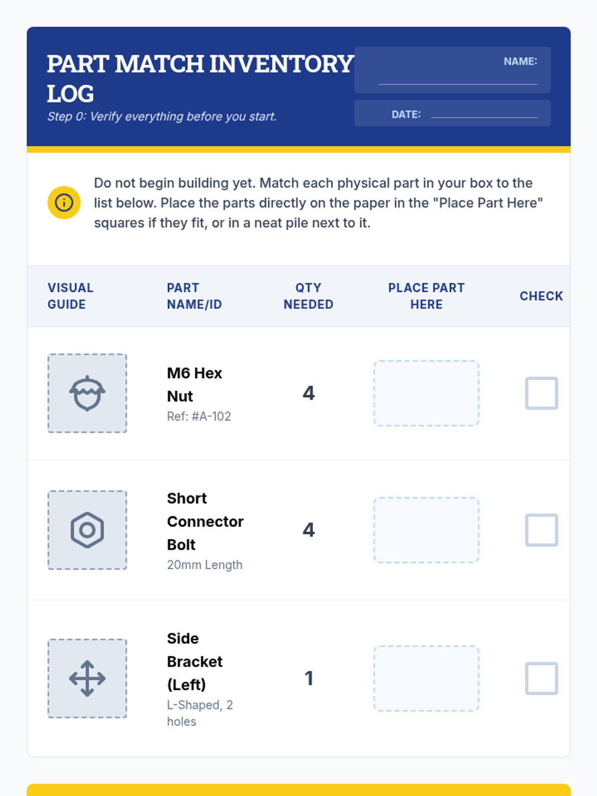 A vocational and life skills sequence focusing on procedural assembly for 12th-grade students with working memory needs. Students practice strict single-step adherence through inventory, fastening, partner systems, and spatial orientation tasks to ensure structural success.