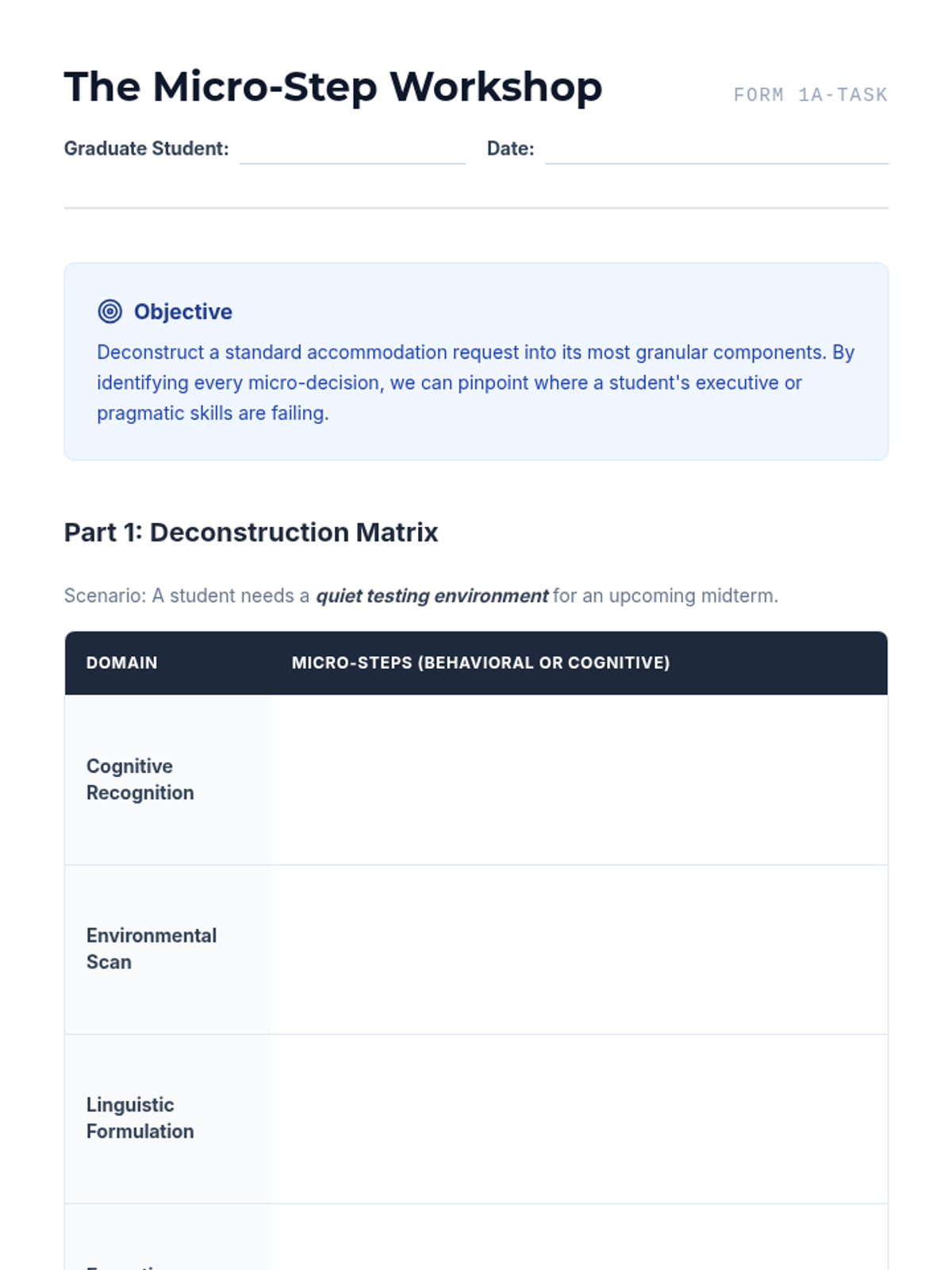 A graduate-level sequence focused on the instructional methodology for teaching self-advocacy skills, specifically requesting accommodations. Graduate students will learn to task-analyze requests, design tiered scripts, facilitate behavioral rehearsals, collect data on advocacy behaviors, and plan for generalization.