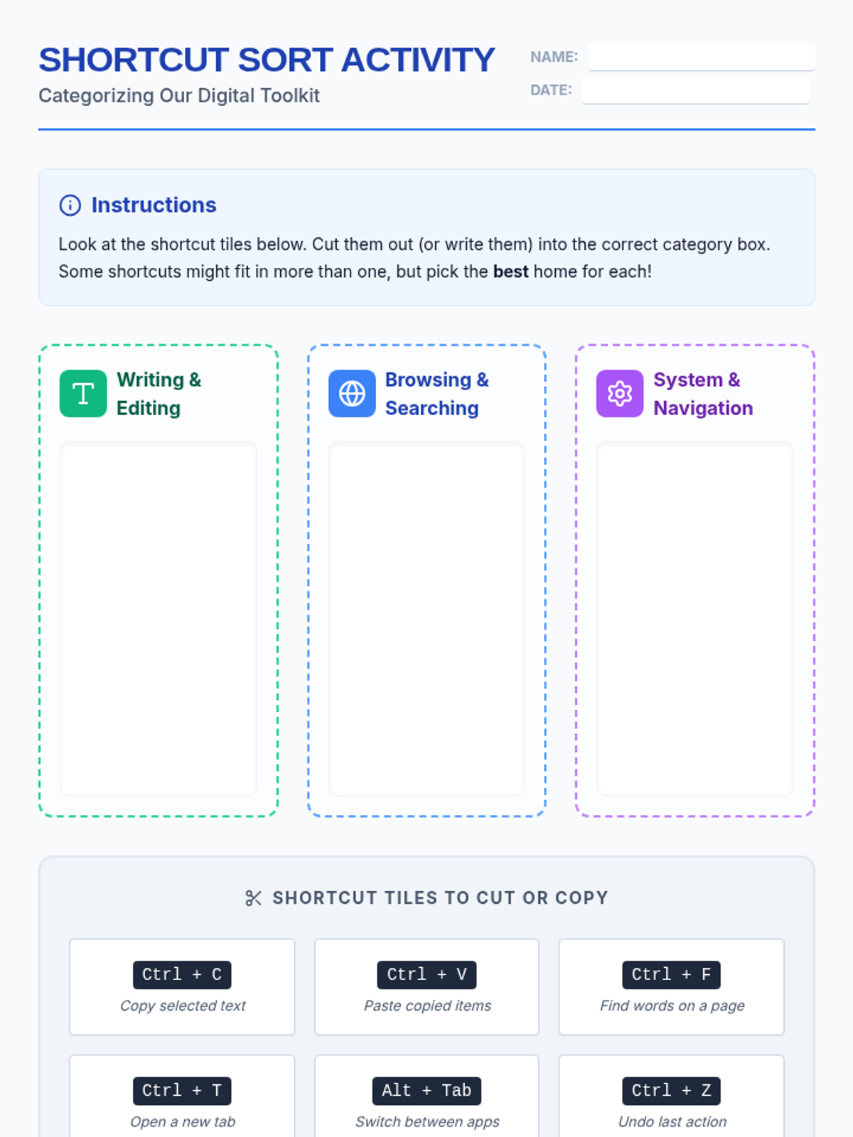 A project-based sequence for 4th-grade students to master keyboard shortcuts as assistive technology. Students progress from reviewing and categorizing shortcuts to identifying personal high-value commands, ultimately designing a personalized accessibility guide and teaching peers.