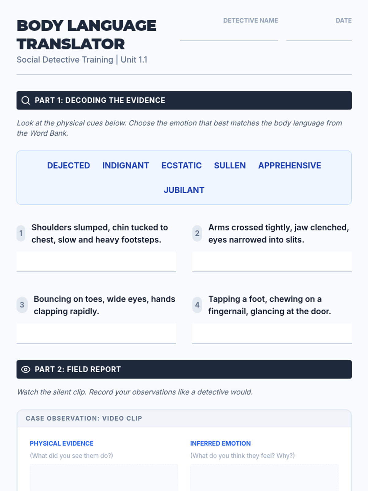 A 5-lesson sequence for 6th Grade SpEd students focusing on inferring character feelings, motivations, and changes using a 'Detective' theme. Students move from decoding physical body language to writing complex internal monologues.