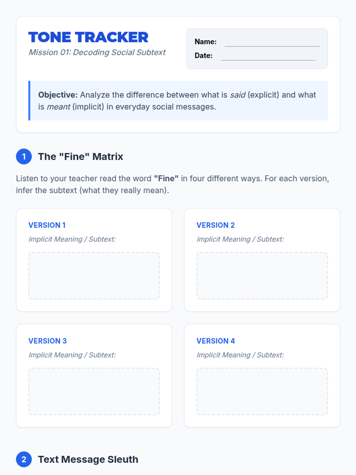 A comprehensive 5-lesson sequence for high school students focusing on the nuances of sarcasm, irony, and social communication through tone, facial expressions, and context clues.