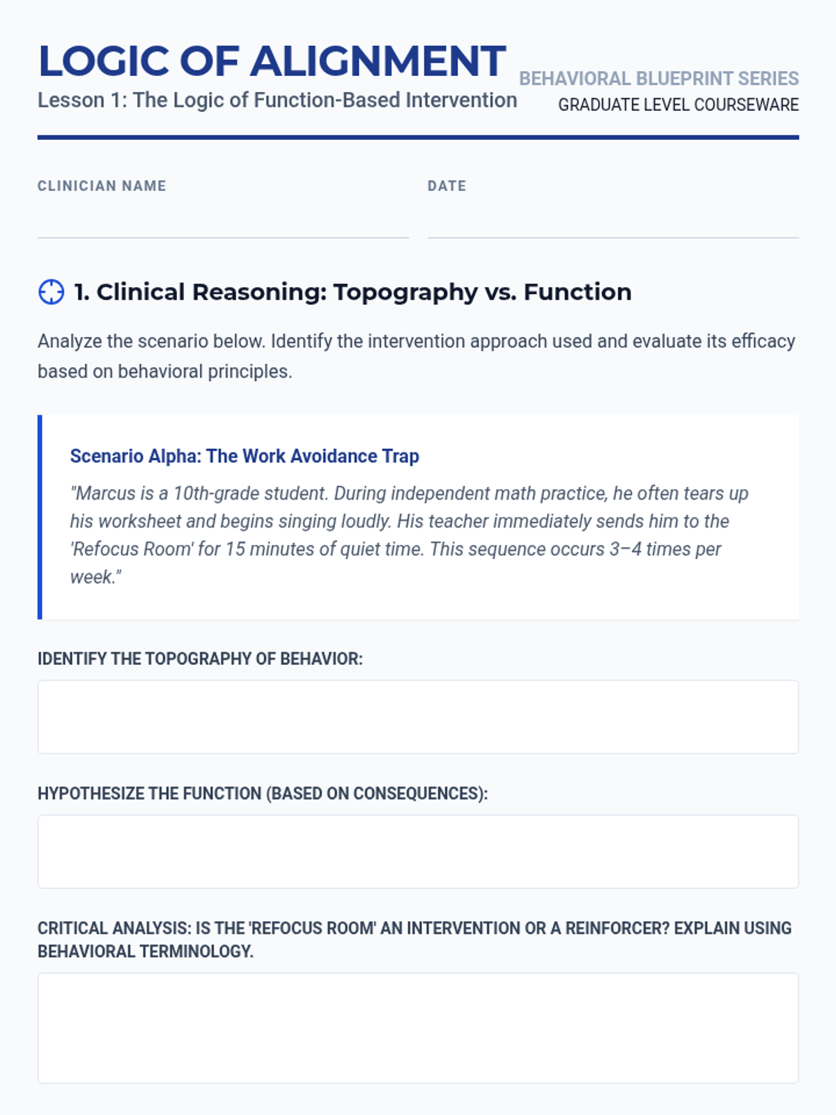 A graduate-level sequence focused on the transition from behavioral assessment to function-matched intervention. Students will master the Competing Behavior Pathway model, learn to select functionally equivalent replacement behaviors (FERBs), and design comprehensive Behavior Intervention Plans (BIPs) that address the root cause of problem behaviors.