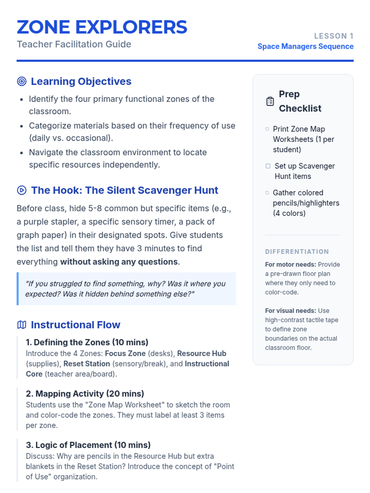 A comprehensive sequence for 7th-grade students focusing on the systematic organization, care, and maintenance of shared classroom resources and sensory tools. Students learn through inquiry, simulation, and leadership roles to foster independence and collective responsibility.