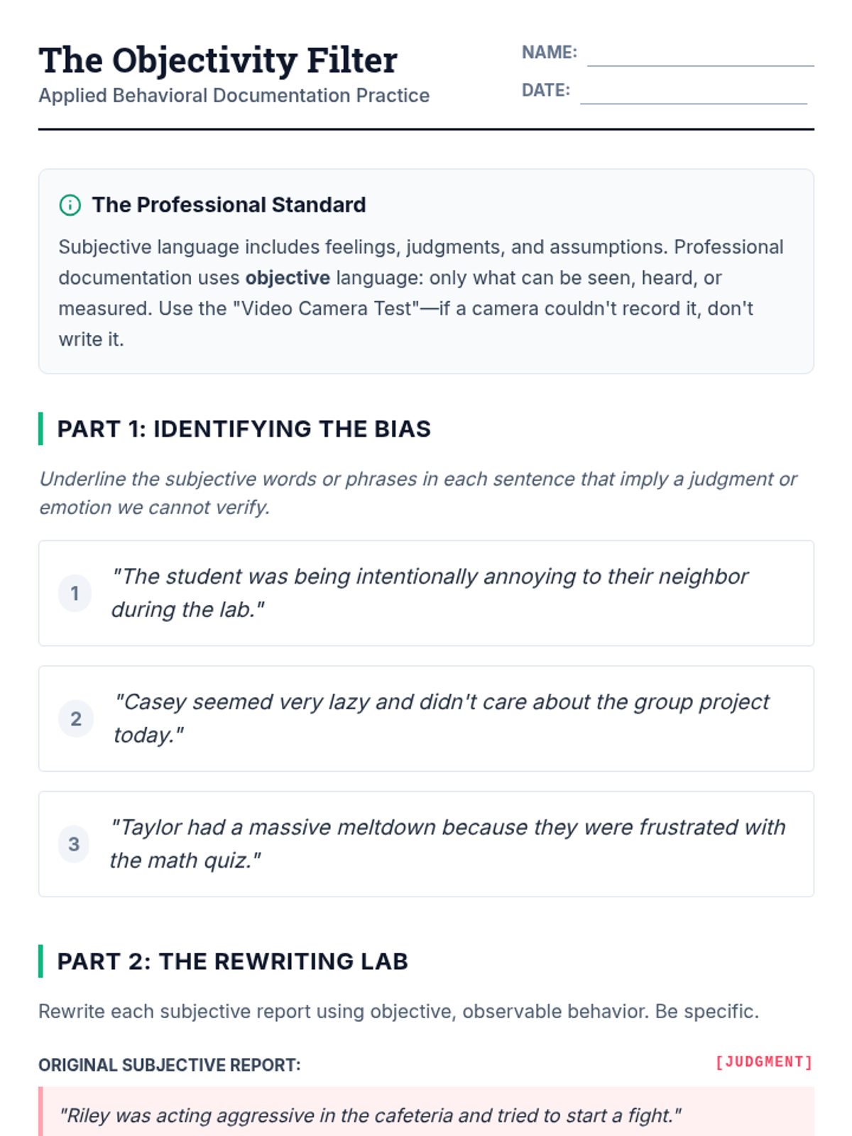 A comprehensive sequence for 11th-grade students on objectively documenting and communicating behavioral escalation signs. Students transition from subjective judgment to objective measurement using the FID and ABC models, culminating in a professional behavioral safety plan.