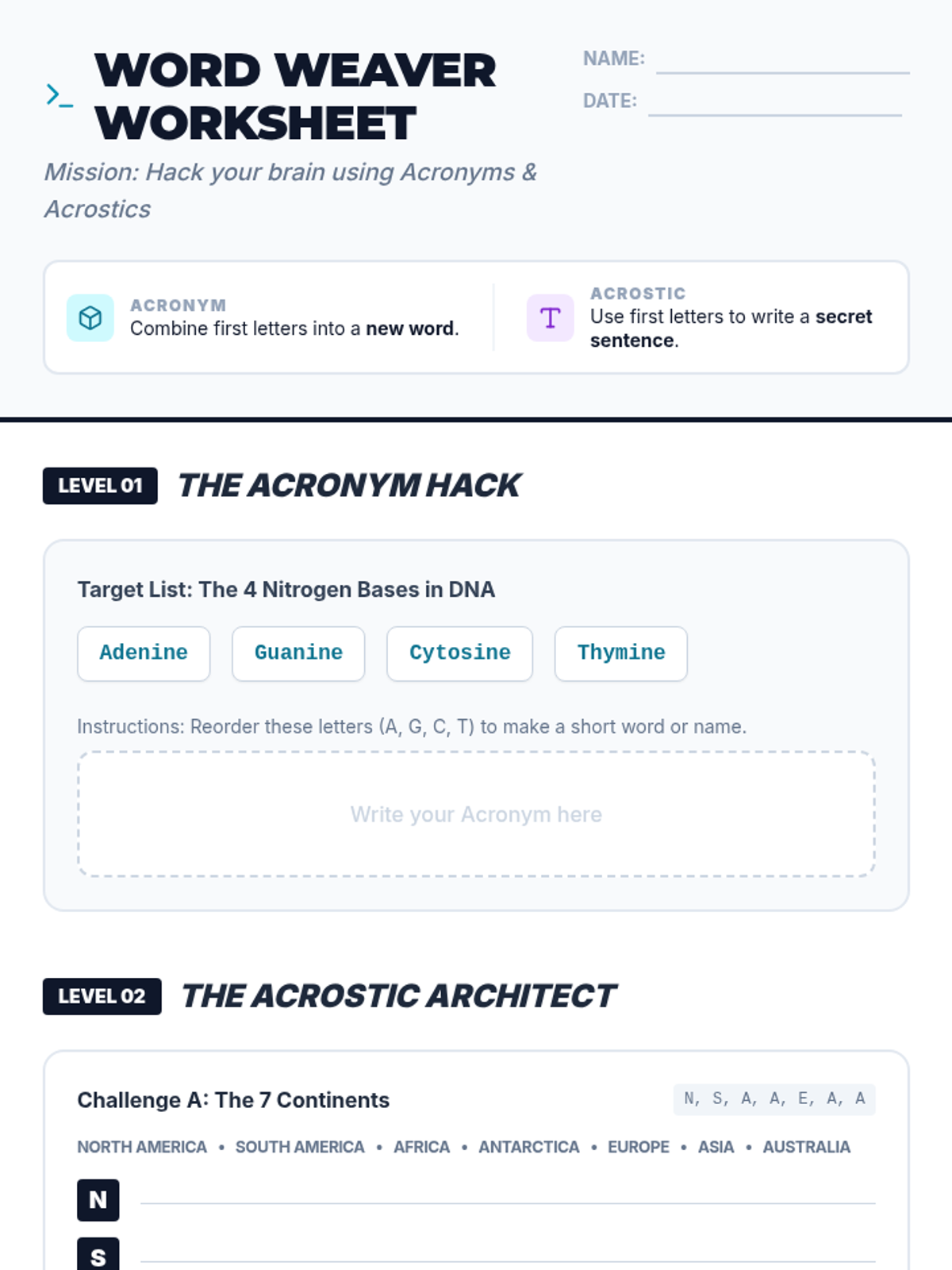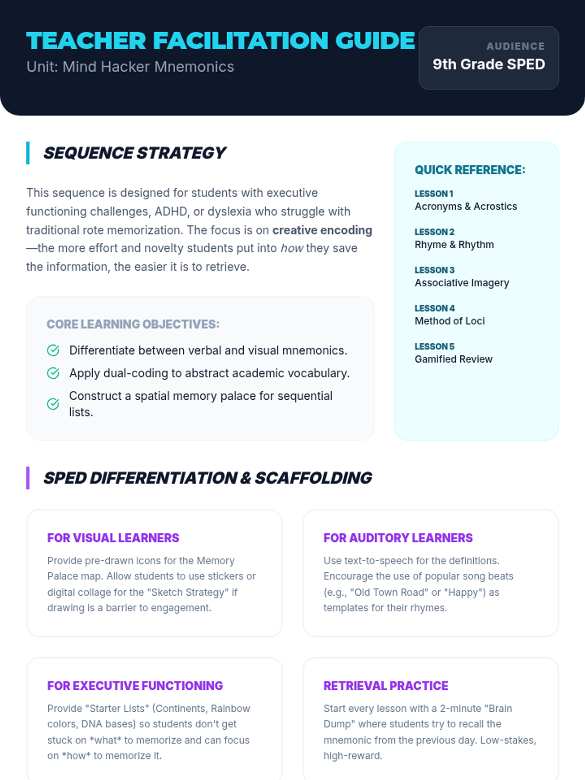 A comprehensive sequence designed to equip 9th-grade students with creative memory strategies. Students will master acronyms, acrostics, rhythmic mnemonics, visual associations, and the Method of Loci to enhance academic retention.