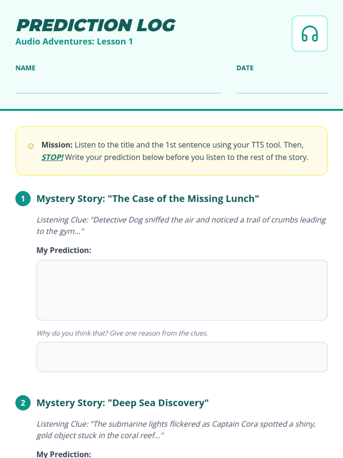 A sequence for 2nd Grade students to master text-to-speech (TTS) as a tool for reading comprehension. Students transition from decoding mechanics to deep understanding by using auditory support to predict, pause, answer questions, visualize, and sequence stories.