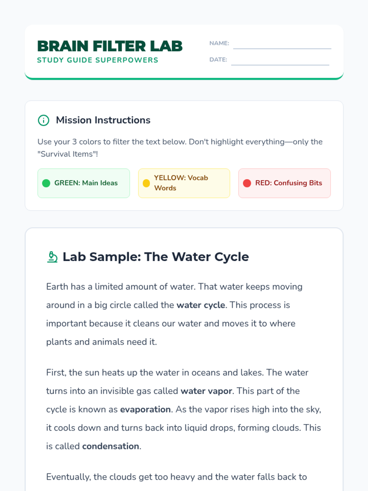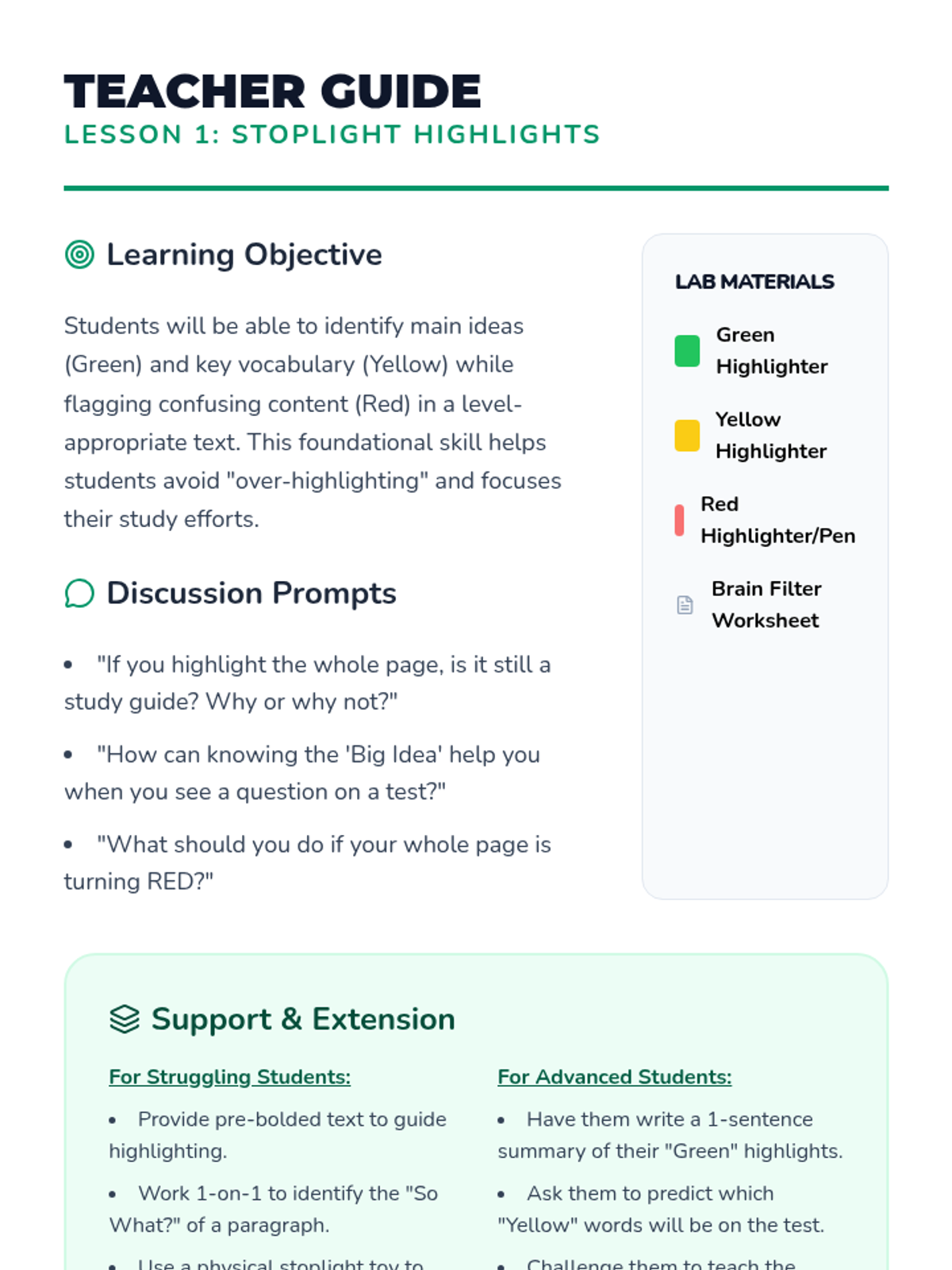 A project-based sequence for 4th-grade students in special education settings, focusing on moving from passive highlighting to active extraction, organization, and synthesis. Students learn to refine highlights, extract them onto cards, sort ideas logically, and create a visual 'One-Page Expert Guide' as a summary tool.