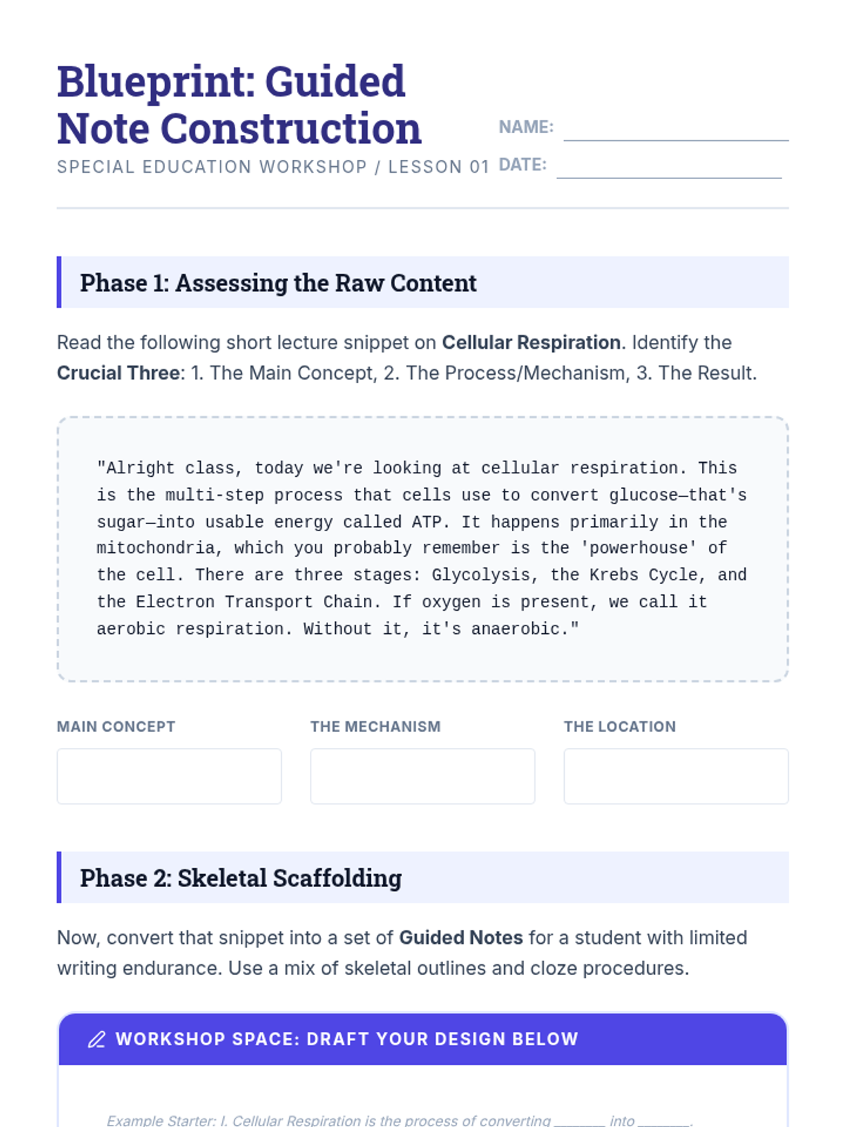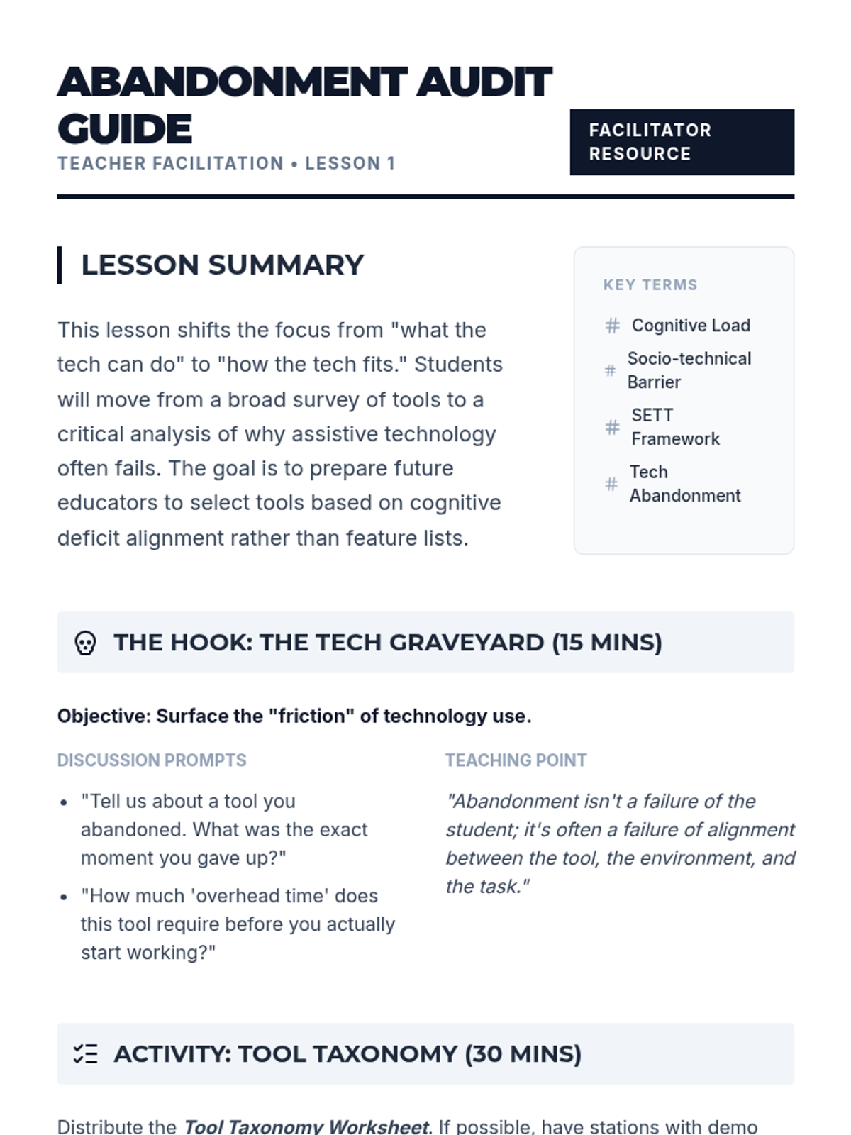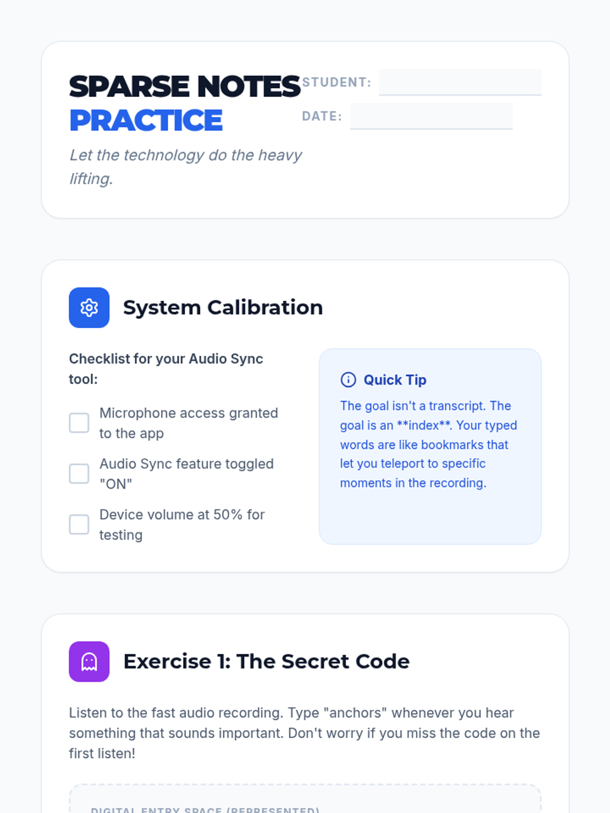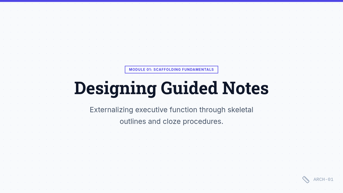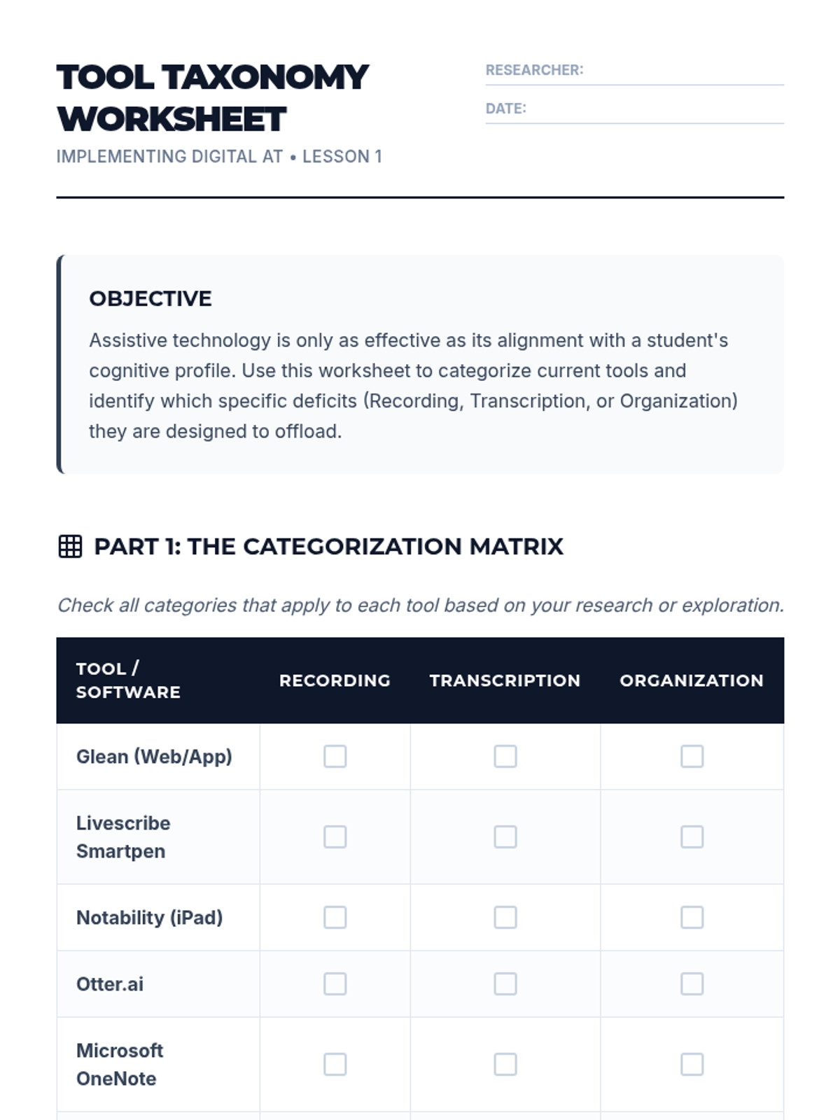 A comprehensive graduate-level sequence on implementing digital assistive technology for note-taking. It covers the transition from traditional methods to audio-synchronization, AI-driven summarization, and executive function-focused organization, concluding with IEP documentation.