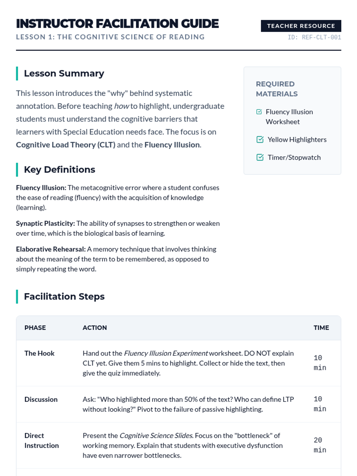 This sequence equips pre-service teachers with evidence-based frameworks for teaching text interaction to students with executive function deficits. It moves from cognitive science foundations to the practical design and assessment of systematic annotation protocols.