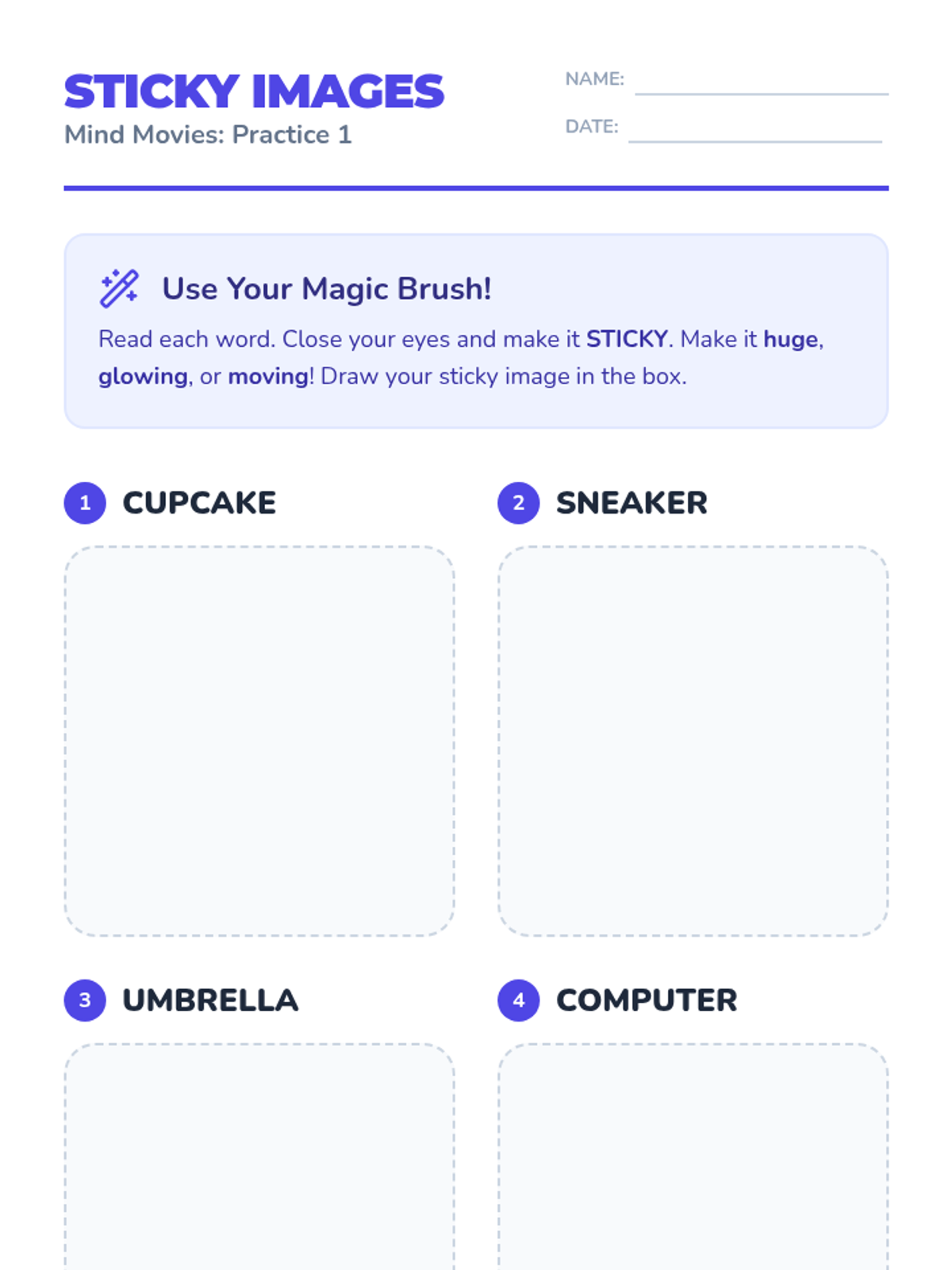 A sequence for 3rd-grade special education students focusing on visualization strategies to improve memory retention and recall. Students learn to create 'sticky' mental images, link concepts, and sequence information using mental imagery.