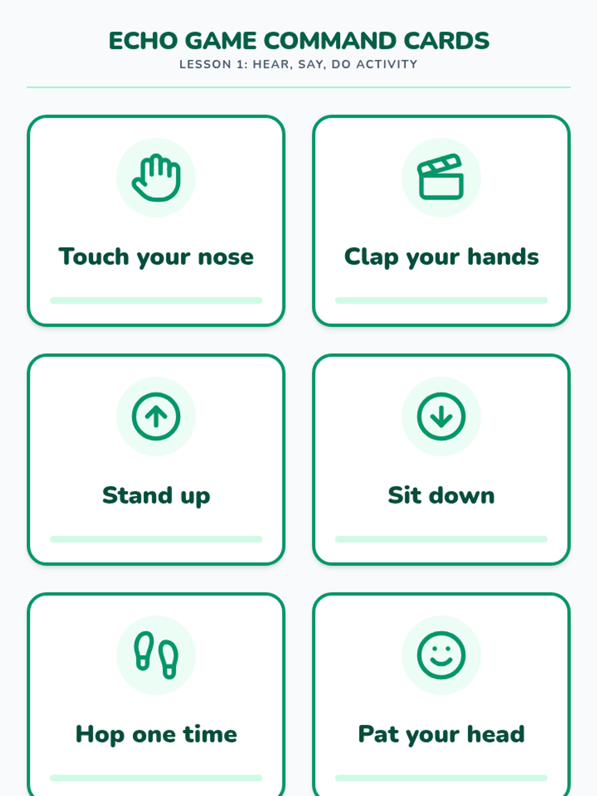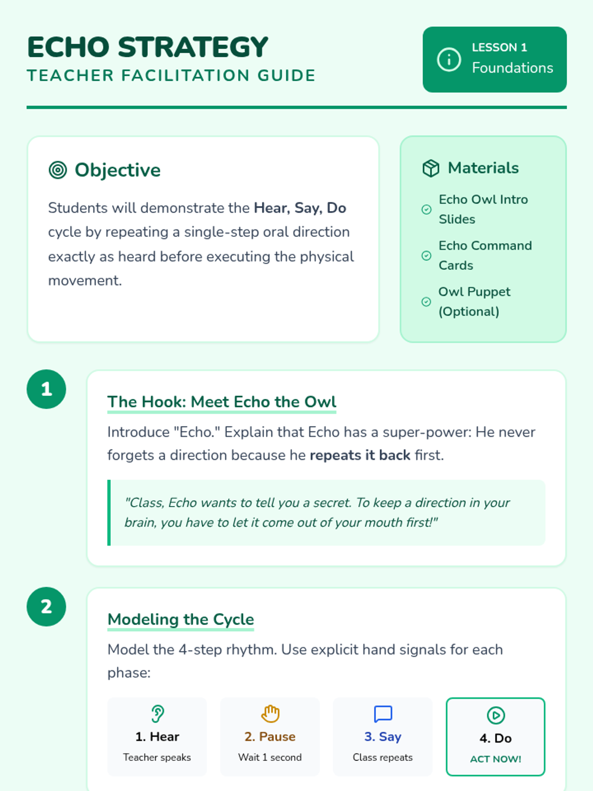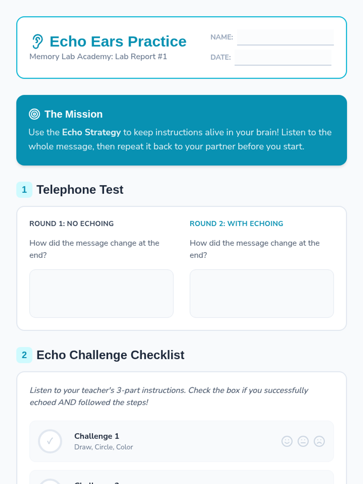 A specialized workshop-style sequence for 1st-grade students to build auditory working memory through verbal rehearsal strategies. Students learn the 'Hear, Say, Do' method to internalize and execute single-step directions, moving from choral repetition to whisper-talk and independent application.
