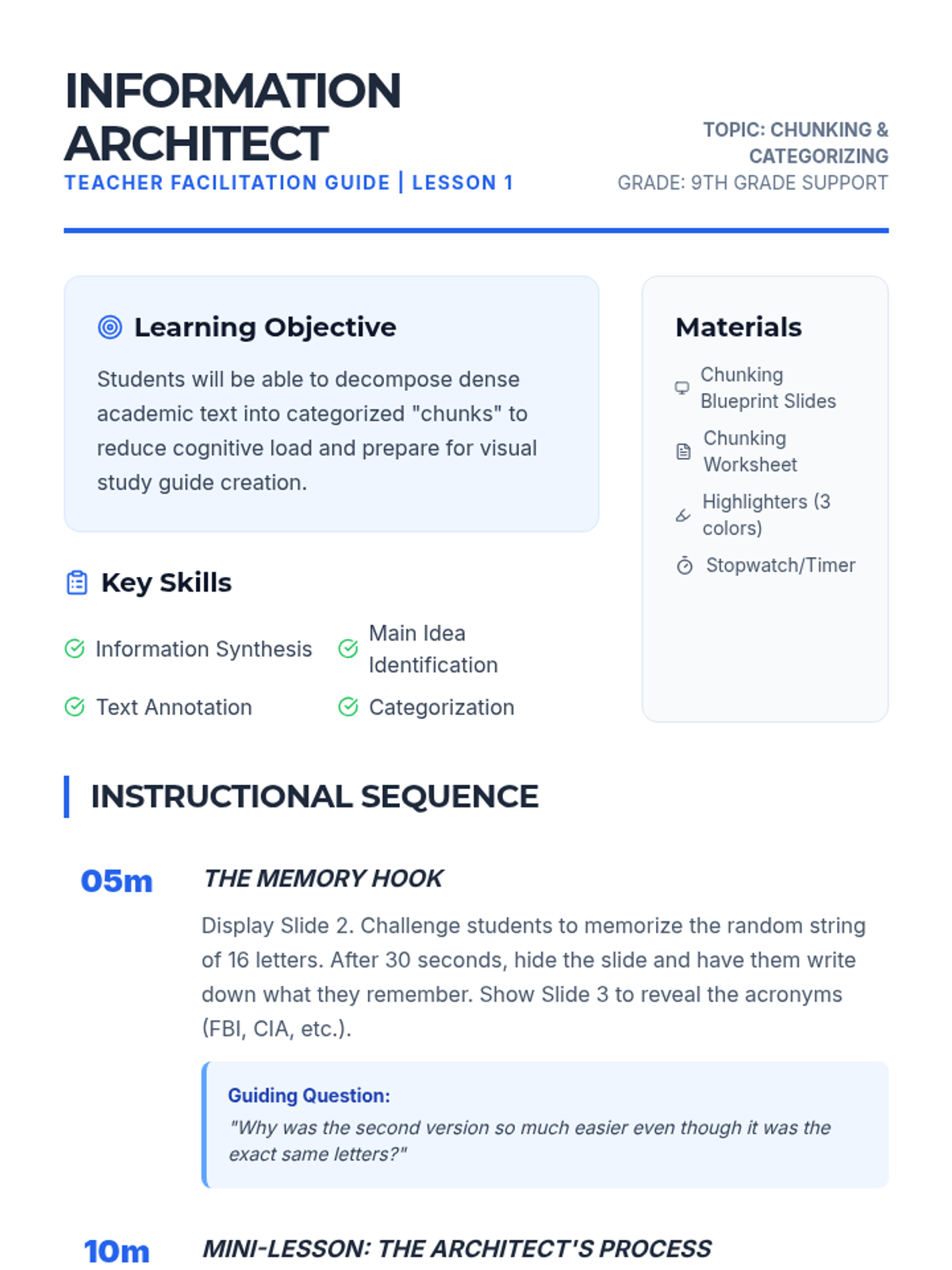 A 5-lesson sequence for 9th-grade students on transforming complex academic information into visual study guides. Students learn chunking, comparison matrices, flowcharts, and concept maps to improve comprehension and memory.