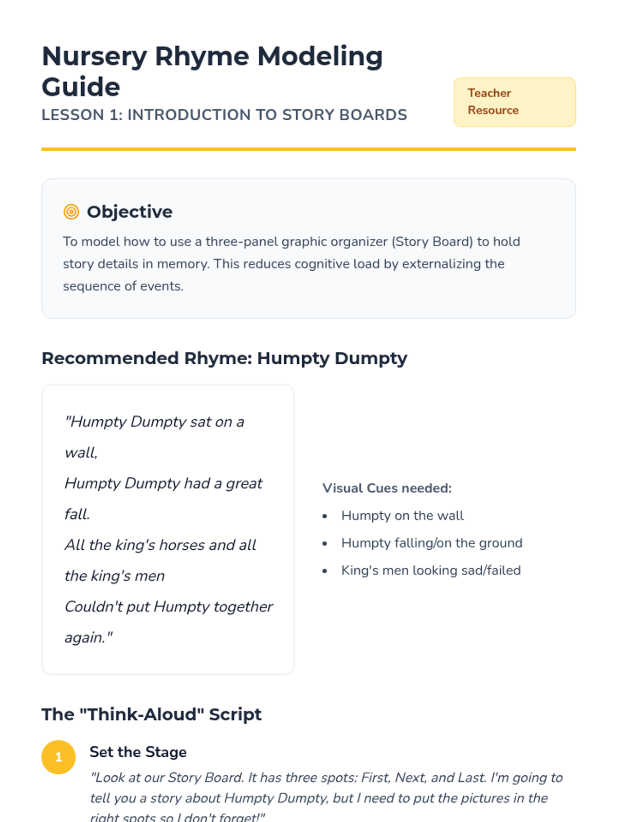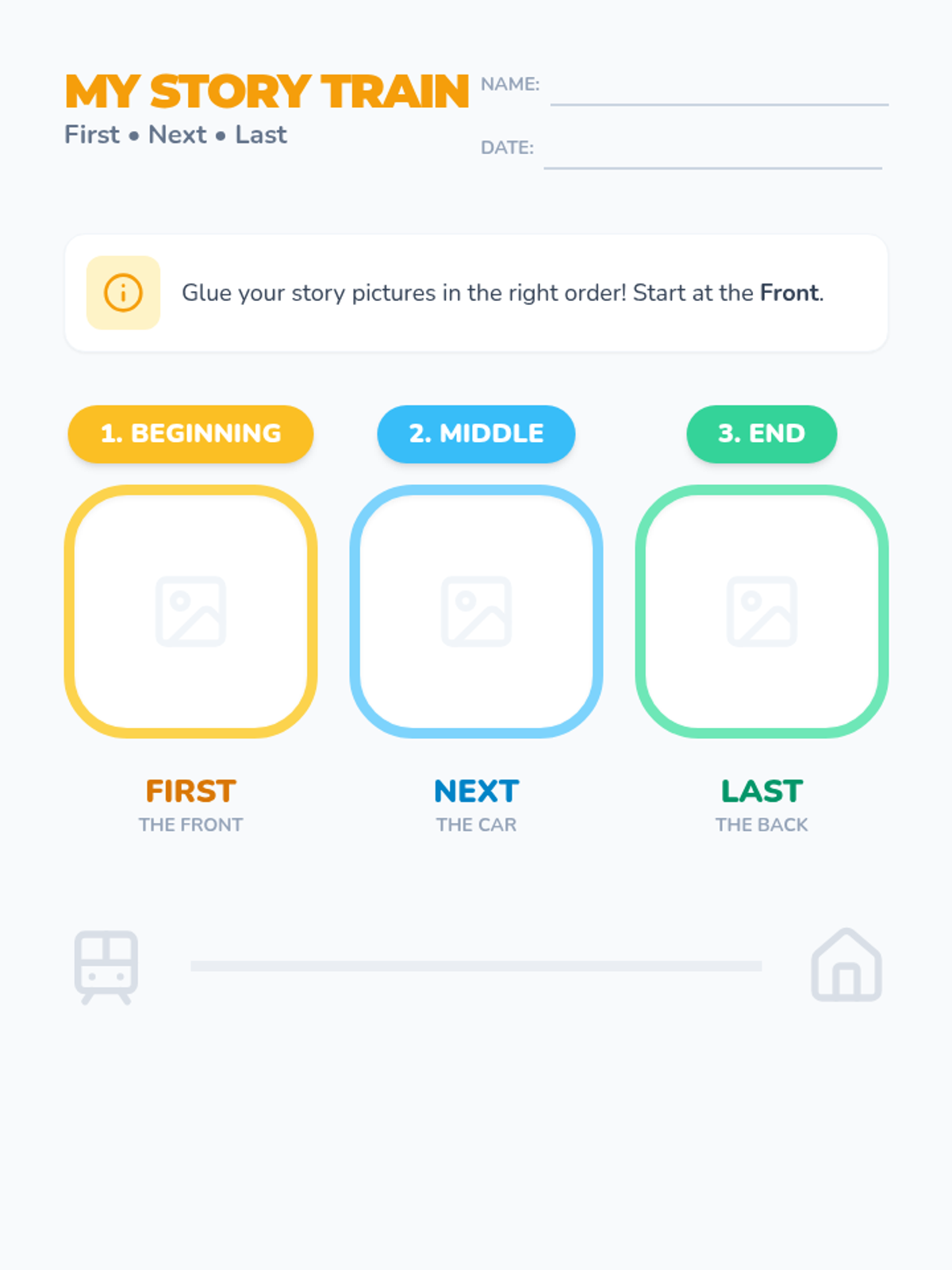 A Kindergarten sequence designed to support academic working memory by using 'First, Next, Last' graphic organizers. Students learn to structure narratives visually, reducing the cognitive load of retelling stories.