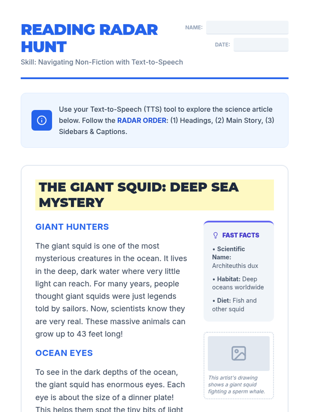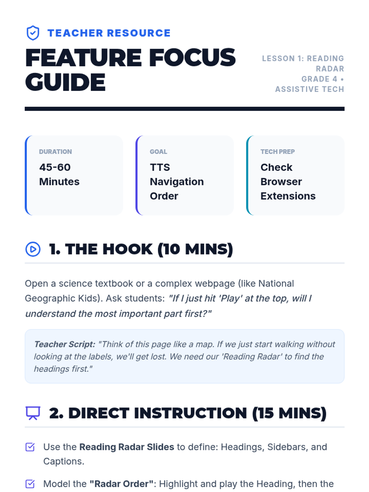 A comprehensive sequence for 4th-grade students to master Text-to-Speech (TTS) assistive technology. Students learn to navigate complex text features, clean up cluttered webpages, tackle math word problems, conduct research, and take effective notes using auditory tools.